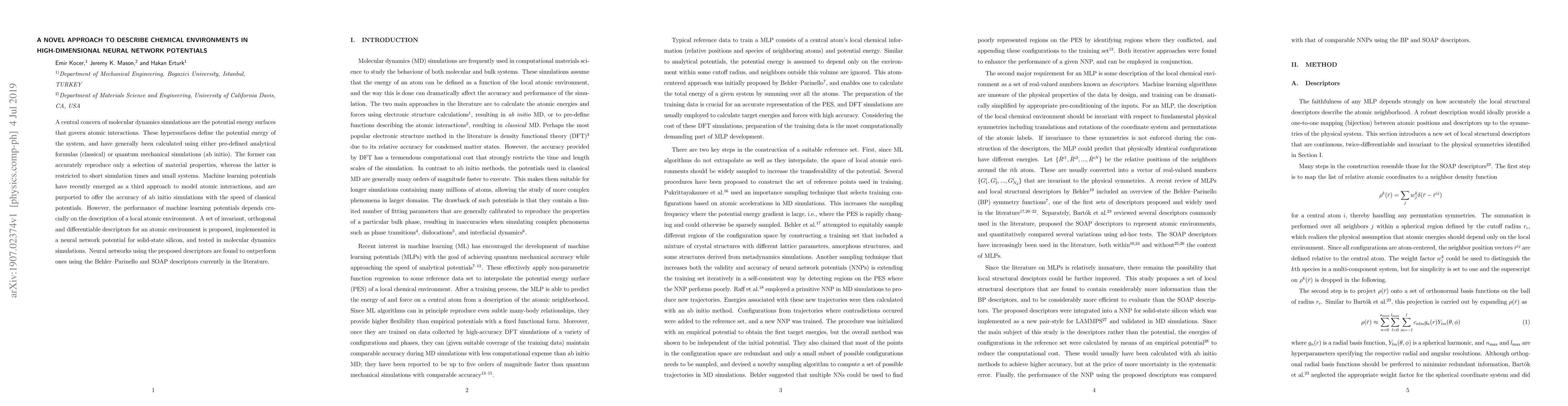 This paper proposes a novel set of descriptors for describing local atomic environments in high-dimensional neural network potentials, which are implemented and tested in simulations of solid-state silicon. The new descriptors outperform existing methods, offering improved accuracy in modeling atomic interactions.