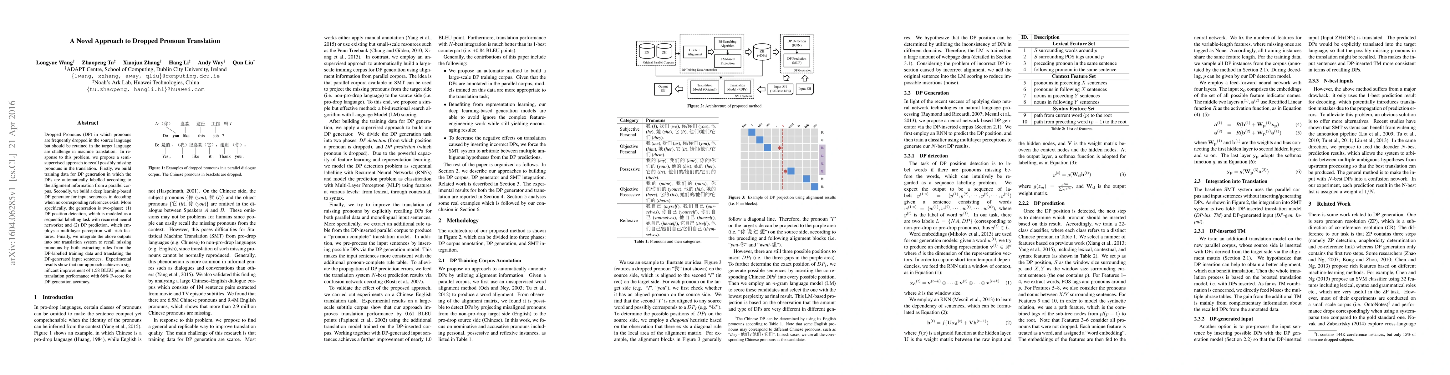 This paper proposes a semi-supervised approach to address dropped pronoun translation in machine translation, utilizing a deep learning-based DP generator and integrating it into a translation system to recall missing pronouns. Experimental results show an improvement of 1.58 BLEU points and 66% F-score for DP generation accuracy.