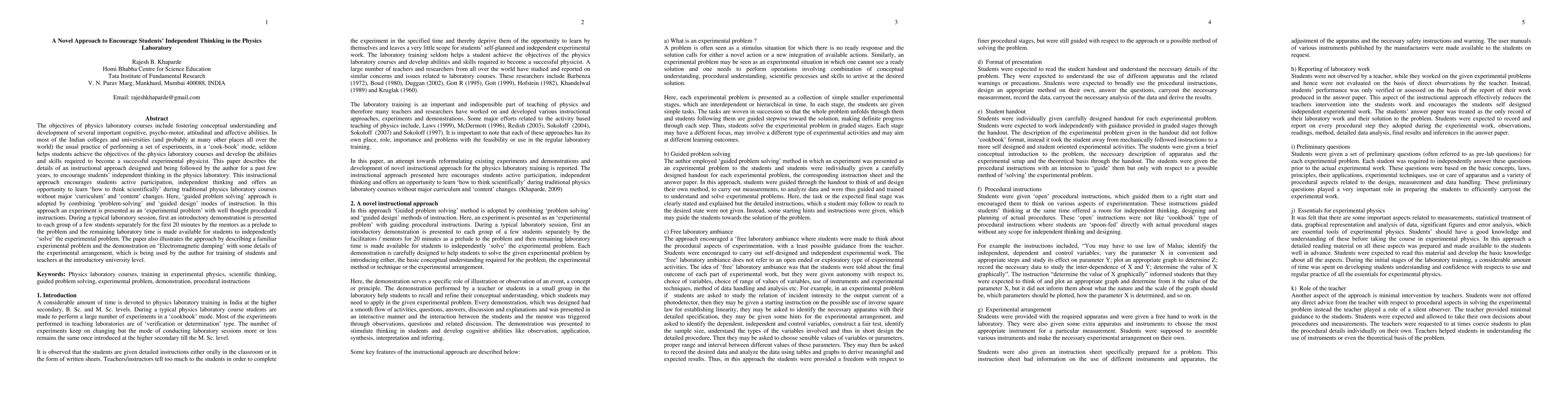 The objectives of physics laboratory courses include fostering conceptual understanding and development of several important cognitive, psycho-motor, attitudinal and affective abilities. In most of the Indian colleges and universities (and probably at many other places all over the world) the usual practice of performing a set of experiments, in a cook-book mode, seldom helps students achieve the objectives of the physics laboratory courses and develop the abilities and skills required to become a successful experimental physicist. This paper describes the details of an instructional approach designed and being followed by the author for a past few years, to encourage students independent thinking in the physics laboratory. This instructional approach encourages students active participation, independent thinking and offers an opportunity to learn how to think scientifically during traditional physics laboratory courses without major curriculum and content changes. Here, guided problem solving approach is adopted by combining problem-solving and guided design modes of instruction. In this approach an experiment is presented as an experimental problem with well thought procedural instructions. During a typical laboratory session, first an introductory demonstration is presented to each group of a few students separately for the first twenty minutes by the mentors as a prelude to the problem and the remaining laboratory time is made available for students to independently solve the experimental problem. The paper also illustrates the approach by describing a familiar experimental problem and the demonstration on Electromagnetic damping with some details of the experimental arrangement, which is being used by the author for training of students and teachers at the introductory university level.