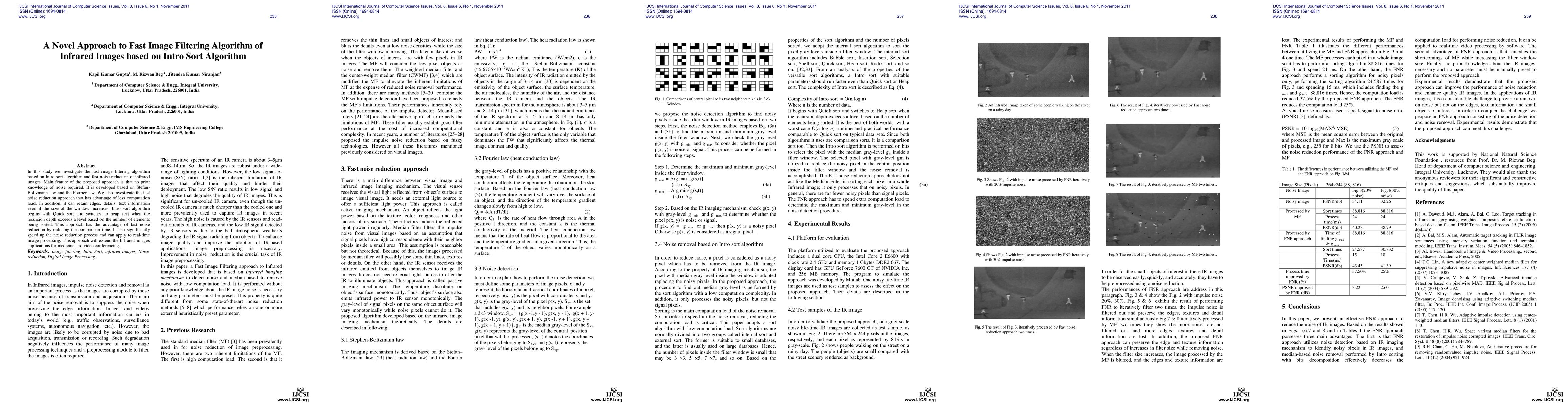 In this study we investigate the fast image filtering algorithm based on Intro sort algorithm and fast noise reduction of infrared images. Main feature of the proposed approach is that no prior knowledge of noise required. It is developed based on Stefan- Boltzmann law and the Fourier law. We also investigate the fast noise reduction approach that has advantage of less computation load. In addition, it can retain edges, details, text information even if the size of the window increases. Intro sort algorithm begins with Quick sort and switches to heap sort when the recursion depth exceeds a level based on the number of elements being sorted. This approach has the advantage of fast noise reduction by reducing the comparison time. It also significantly speed up the noise reduction process and can apply to real-time image processing. This approach will extend the Infrared images applications for medicine and video conferencing.