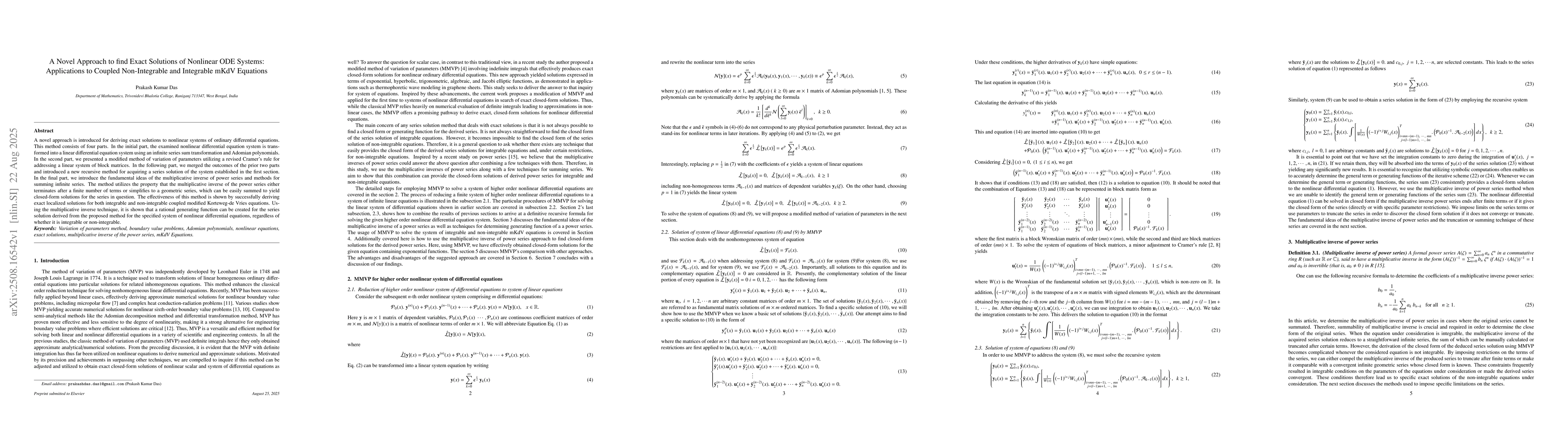 A novel approach is introduced for deriving exact solutions to nonlinear systems of ordinary differential equations. This method consists of four parts. In the initial part, the examined nonlinear differential equation system is transformed into a linear differential equation system using an infinite series sum transformation and Adomian polynomials. In the second part, we presented a modified method of variation of parameters utilizing a revised Cramer's rule for addressing a linear system of block matrices. In the following part, we merged the outcomes of the prior two parts and introduced a new recursive method for acquiring a series solution of the system established in the first section. In the final part, we introduce the fundamental ideas of the multiplicative inverse of power series and methods for summing infinite series. The method utilizes the property that the multiplicative inverse of the power series either terminates after a finite number of terms or simplifies to a geometric series, which can be easily summed to yield closed-form solutions for the series in question. The effectiveness of this method is shown by successfully deriving exact localized solutions for both integrable and non-integrable coupled modified Korteweg-de Vries equations. Using the multiplicative inverse technique, it is shown that a rational generating function can be created for the series solution derived from the proposed method for the specified system of nonlinear differential equations, regardless of whether it is integrable or non-integrable.