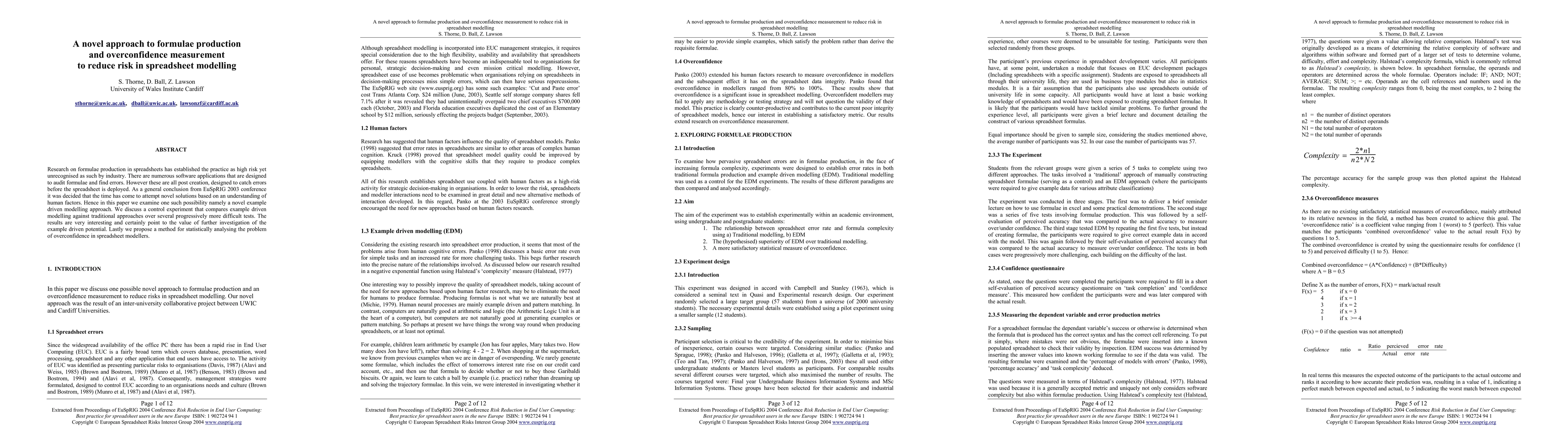 This paper introduces a novel example-driven modelling approach to reduce risks in spreadsheet formulae production, contrasting it with traditional methods in a control experiment. The results suggest significant potential benefits, and the paper also proposes a method for measuring overconfidence among spreadsheet modellers.