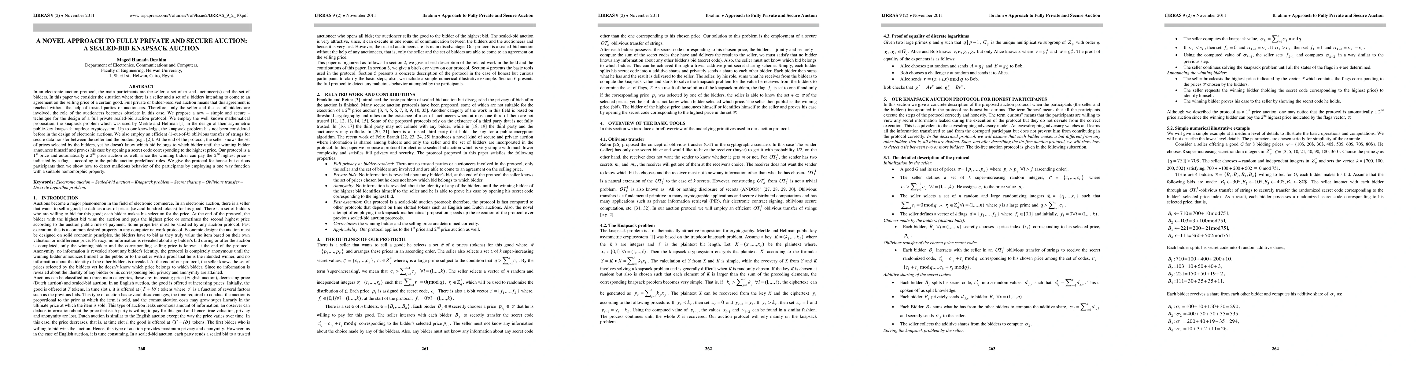 In an electronic auction protocol, the main participants are the seller, a set of trusted auctioneer(s) and the set of bidders. In this paper we consider the situation where there is a seller and a set of n bidders intending to come to an agreement on the selling price of a certain good. Full private or bidder-resolved auction means that this agreement is reached without the help of trusted parties or auctioneers. Therefore, only the seller and the set of bidders are involved, the role of the auctioneers becomes obsolete in this case. property.We propose a new technique for the design of a full private sealed-bid auction protocol.