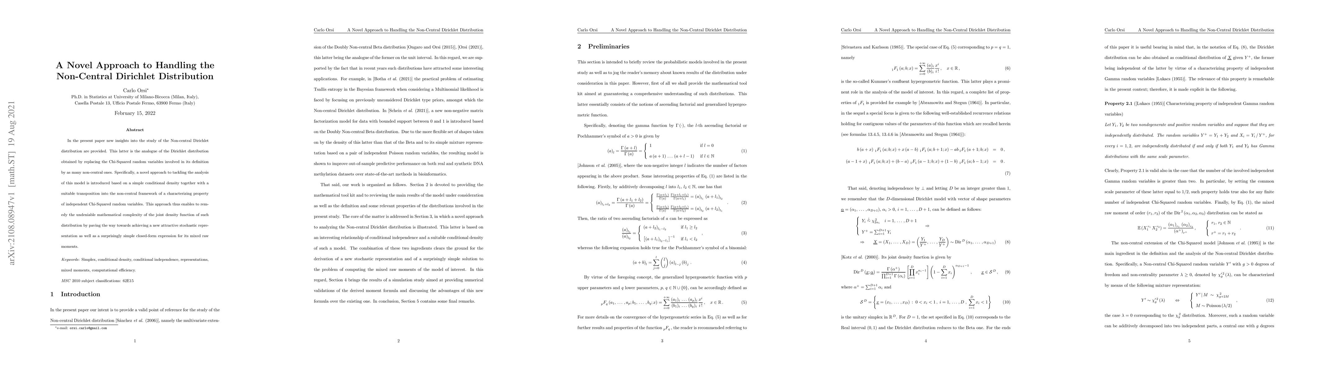 In the present paper new insights into the study of the Non-central Dirichlet distribution are provided. This latter is the analogue of the Dirichlet distribution obtained by replacing the Chi-Squared random variables involved in its definition by as many non-central ones. Specifically, a novel approach to tackling the analysis of this model is introduced based on a simple conditional density together with a suitable transposition into the non-central framework of a characterizing property of independent Chi-Squared random variables. This approach thus enables to remedy the undeniable mathematical complexity of the joint density function of such distribution by paving the way towards achieving a new attractive stochastic representation as well as a surprisingly simple closed-form expression for its mixed raw moments.
