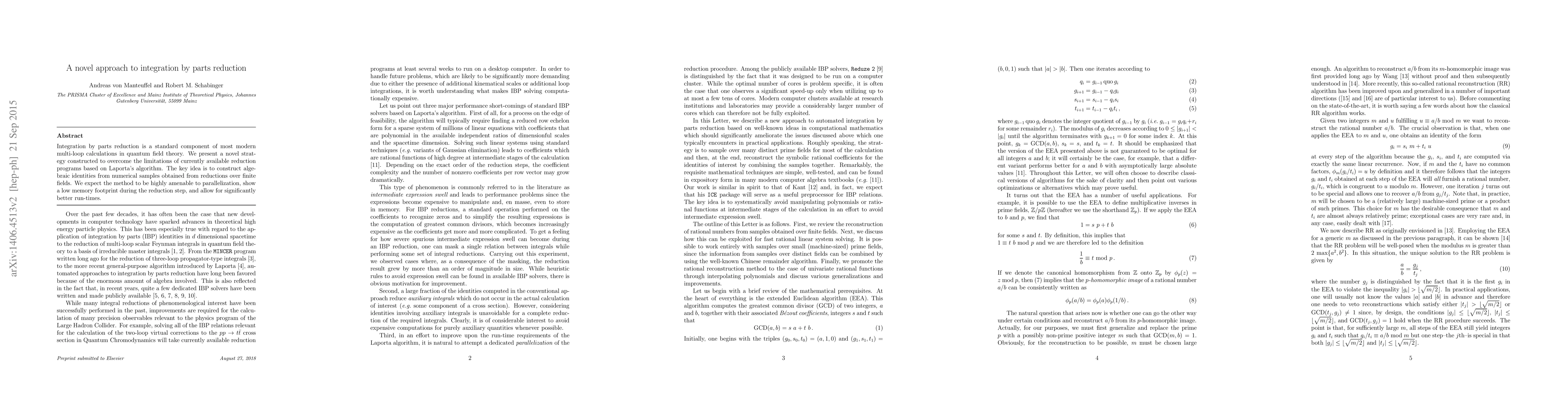 This paper introduces a new method for integration by parts reduction in quantum field theory, aiming to improve upon existing Laporta's algorithm-based programs. The novel strategy leverages algebraic identities derived from numerical samples over finite fields, promising better parallelization, lower memory usage, and faster computation times.