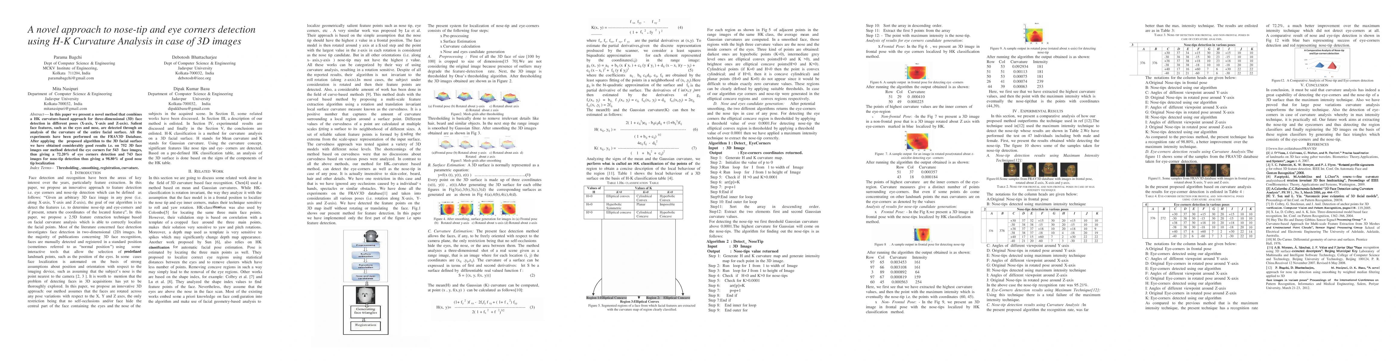 In this paper we present a novel method that combines a HK curvature-based approach for three-dimensional (3D) face detection in different poses (X-axis, Y-axis and Z-axis). Salient face features, such as the eyes and nose, are detected through an analysis of the curvature of the entire facial surface. All the experiments have been performed on the FRAV3D Database. After applying the proposed algorithm to the 3D facial surface we have obtained considerably good results i.e. on 752 3D face images our method detected the eye corners for 543 face images, thus giving a 72.20% of eye corners detection and 743 face images for nose-tip detection thus giving a 98.80% of good nose tip localization