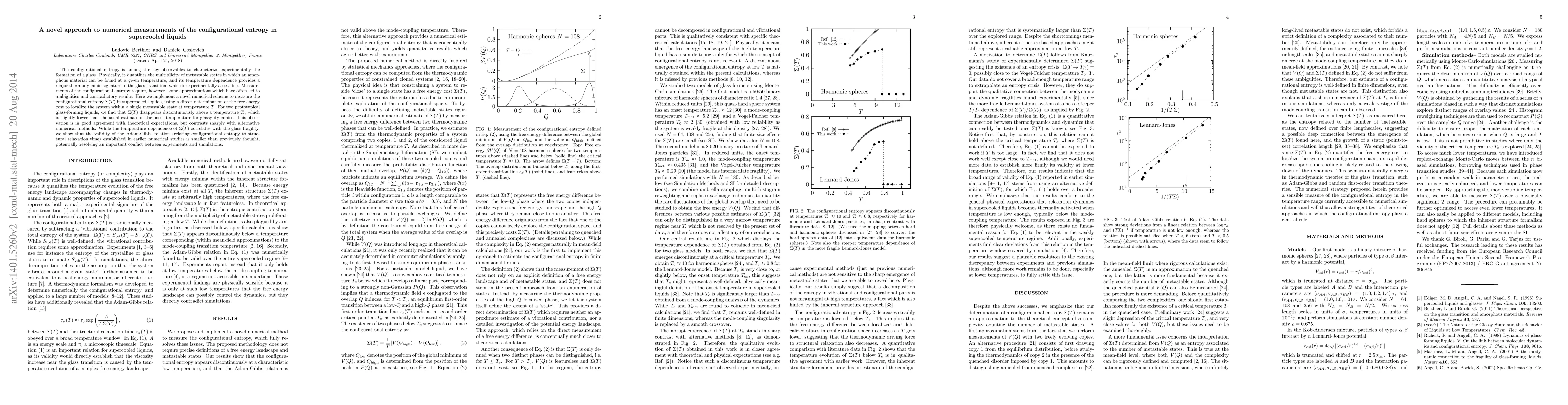 This paper introduces a novel numerical method for measuring the configurational entropy in supercooled liquids, finding that it disappears discontinuously above a temperature T_c, which is slightly lower than the onset temperature for glassy dynamics. The results challenge previous numerical methods and suggest a reevaluation of the Adam-Gibbs relation.
