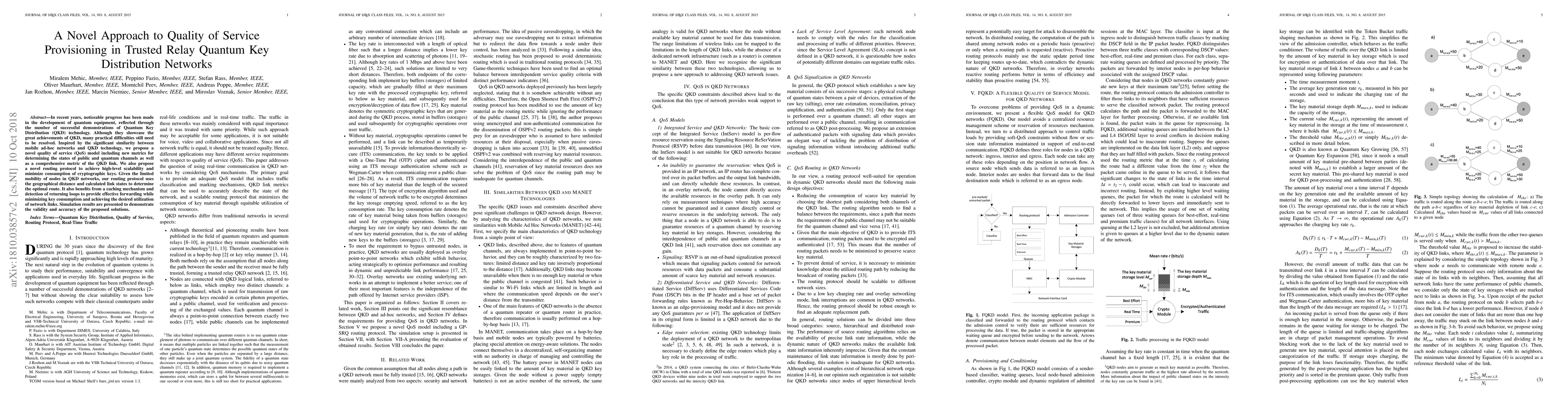 In recent years, noticeable progress has been made in the development of quantum equipment, reflected through the number of successful demonstrations of Quantum Key Distribution (QKD) technology. Although they showcase the great achievements of QKD, many practical difficulties still need to be resolved. Inspired by the significant similarity between mobile ad-hoc networks and QKD technology, we propose a novel quality of service (QoS) model including new metrics for determining the states of public and quantum channels as well as a comprehensive metric of the QKD link. We also propose a novel routing protocol to achieve high-level scalability and minimize consumption of cryptographic keys. Given the limited mobility of nodes in QKD networks, our routing protocol uses the geographical distance and calculated link states to determine the optimal route. It also benefits from a caching mechanism and detection of returning loops to provide effective forwarding while minimizing key consumption and achieving the desired utilization of network links. Simulation results are presented to demonstrate the validity and accuracy of the proposed solutions.