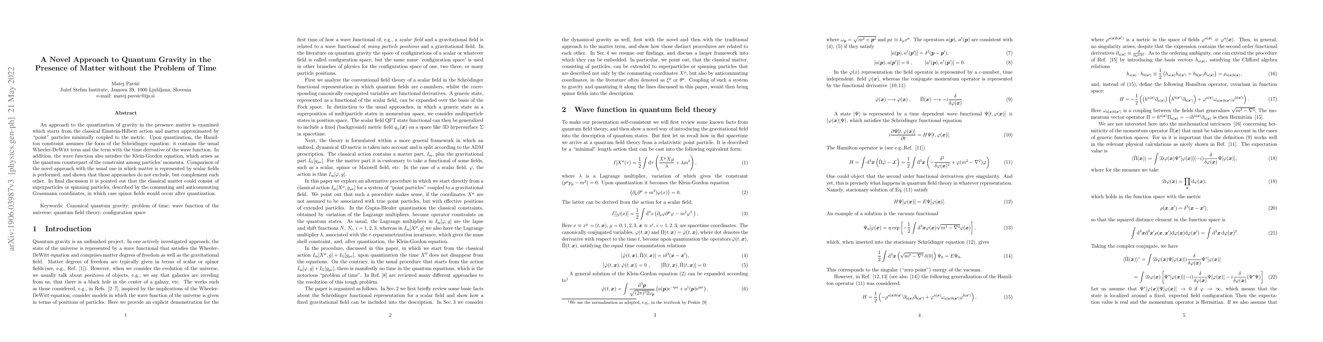 An approach to the quantization of gravity in the presence matter is examined which starts from the classical Einstein-Hilbert action and matter approximated by "point" particles minimally coupled to the metric. Upon quantization, the Hamilton constraint assumes the form of the Schr\"odinger equation: it contains the usual Wheeler-DeWitt term and the term with the time derivative of the wave function. In addition, the wave function also satisfies the Klein-Gordon equation, which arises as the quantum counterpart of the constraint among particles' momenta. Comparison of the novel approach with the usual one in which matter is represented by scalar fields is performed, and shown that those approaches do not exclude, but complement each other. In final discussion it is pointed out that the classical matter could consist of superparticles or spinning particles, described by the commuting and anticommuting Grassmann coordinates, in which case spinor fields would occur after quantization.