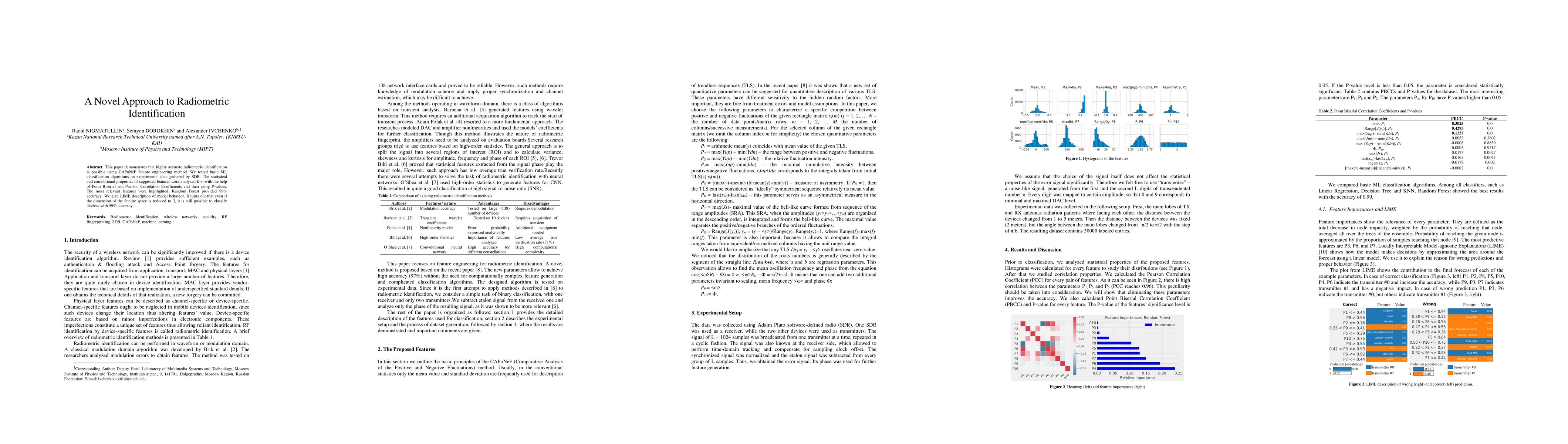 This paper demonstrates that highly accurate radiometric identification is possible using CAPoNeF feature engineering method. We tested basic ML classification algorithms on experimental data gathered by SDR. The statistical and correlational properties of suggested features were analyzed first with the help of Point Biserial and Pearson Correlation Coefficients and then using P-values. The most relevant features were highlighted. Random Forest provided 99% accuracy. We give LIME description of model behavior. It turns out that even if the dimension of the feature space is reduced to 3, it is still possible to classify devices with 99% accuracy.