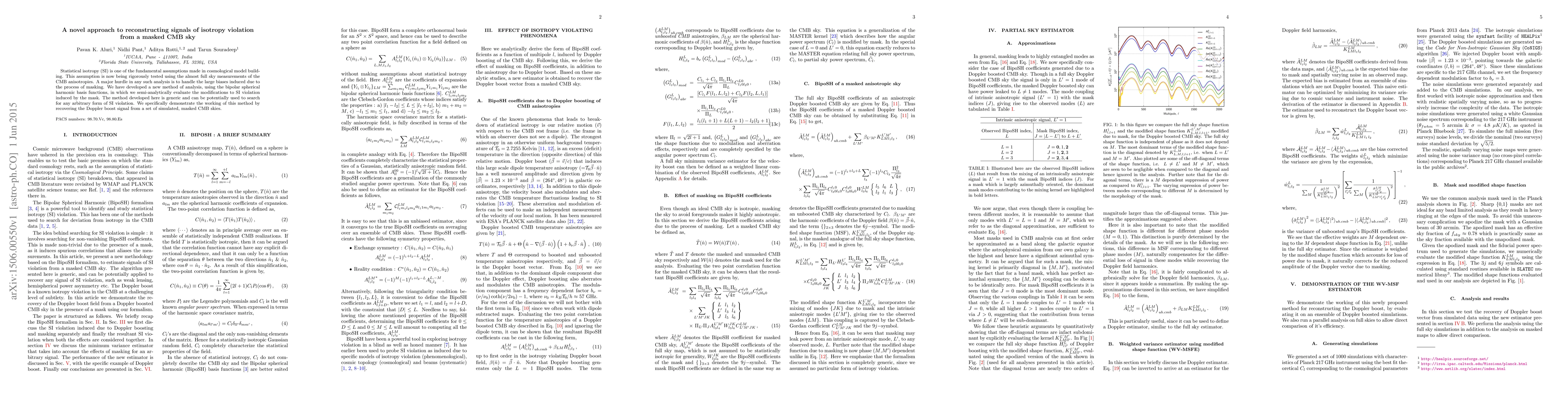 Statistical isotropy (SI) is one of the fundamental assumptions made in cosmological model building. This assumption is now being rigorously tested using the almost full sky measurements of the CMB anisotropies. A major hurdle in any such analysis is to handle the large biases induced due to the process of masking. We have developed a new method of analysis, using the bipolar spherical harmonic basis functions, in which we semi-analytically evaluate the modifications to SI violation induced by the mask. The method developed here is generic and can be potentially used to search for any arbitrary form of SI violation. We specifically demonstrate the working of this method by recovering the Doppler boost signal from a set of simulated, masked CMB skies.