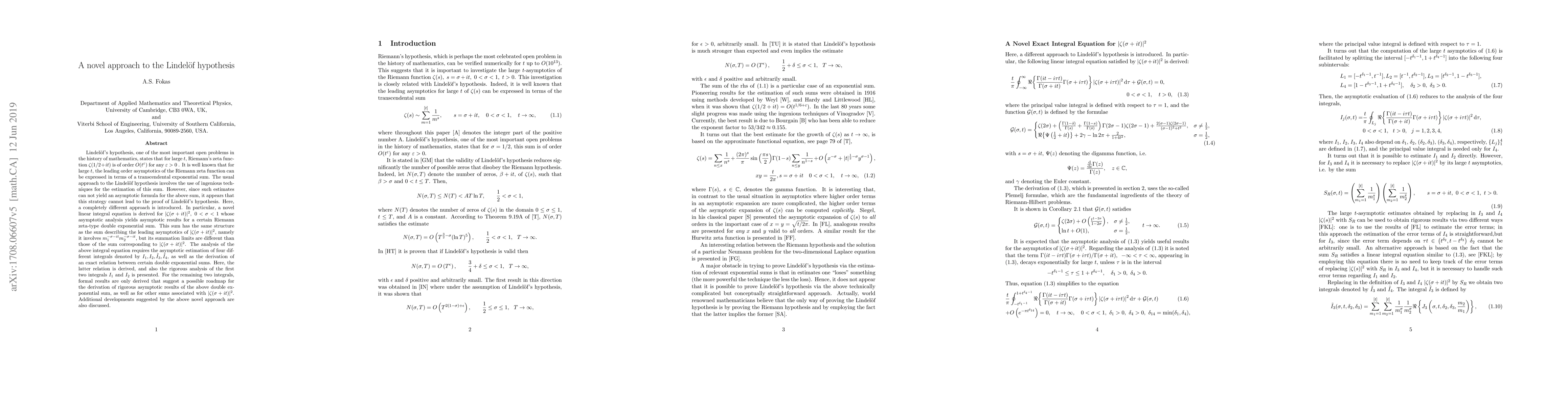 Lindel{\"o}f's hypothesis, one of the most important open problems in the history of mathematics, states that for large $t$, Riemann's zeta function $\zeta(1/2+it)$ is of order $O(t^{\varepsilon})$ for any $\varepsilon>0$ . It is well known that for large $t$, the leading order asymptotics of the Riemann zeta function can be expressed in terms of a transcendental exponential sum. The usual approach to the Lindel\"of hypothesis involves the use of ingenious techniques for the estimation of this sum. However, since such estimates can not yield an asymptotic formula for the above sum, it appears that this strategy cannot lead to the proof of Lindel\"of's hypothesis. Here, a completely different approach is introduced. In particular, a novel linear integral equation is derived for $|\zeta(\sigma+it)|^2, \ 0<\sigma<1$ whose asymptotic analysis yields asymptotic results for a certain Riemann zeta-type double exponential sum. This sum has the same structure as the sum describing the leading asymptotics of $|\zeta(\sigma+it)|^2$, namely it involves $m_1^{-\sigma-it}m_2^{-\sigma-it}$, but its summation limits are different than those of the sum corresponding to $|\zeta(\sigma+it)|^2$. The analysis of the above integral equation requires the asymptotic estimation of four different integrals denoted by $I_1,I_2,\tilde{I}_3,\tilde{I}_4$, as well as the derivation of an exact relation between certain double exponential sums. Here, the latter relation is derived, and also the rigorous analysis of the first two integrals $I_1$ and $I_2$ is presented. For the remaining two integrals, formal results are only derived that suggest a possible roadmap for the derivation of rigorous asymptotic results of the above double exponential sum, as well as for other sums associated with $|\zeta(\sigma+it)|^2$. Additional developments suggested by the above novel approach are also discussed.