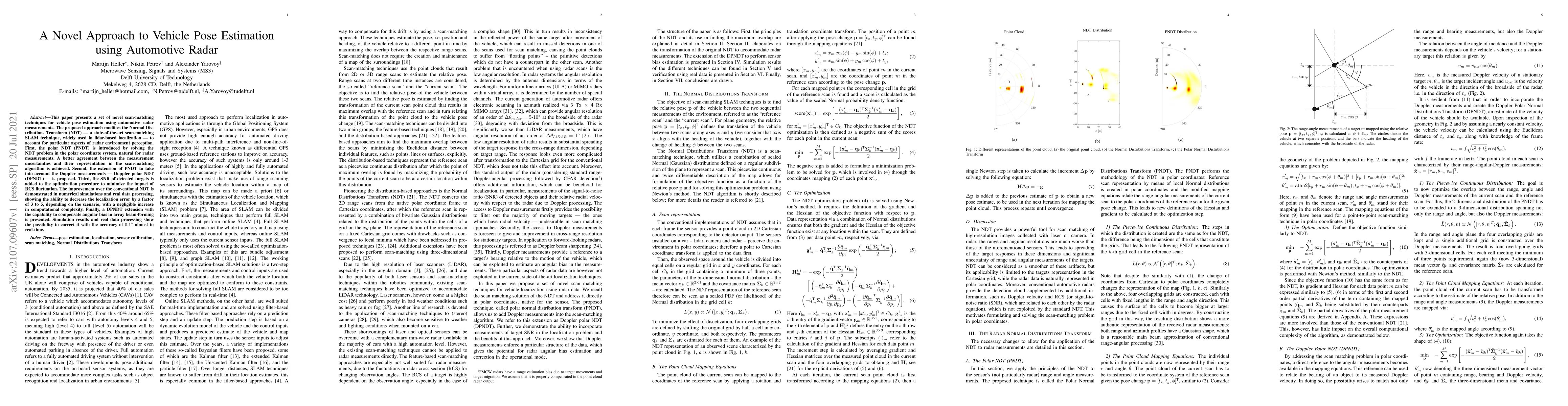 This paper presents a set of novel scan-matching techniques for vehicle pose estimation using automotive radar measurements. The proposed approach modifies the Normal Distributions Transform (NDT) -- a state-of-the-art scan-matching SLAM technique, widely used in lidar-based localization -- to account for particular aspects of radar environment perception. First, the polar NDT (PNDT) is introduced by solving the NDT problem in the polar coordinate system, natural for radar measurements. A better agreement between the measurement uncertainties and their representation in the scan-matching algorithm is achieved. Second, the extension of PNDT to take into account the Doppler measurements -- Doppler polar NDT (DPNDT) -- is proposed. Third, the SNR of detected targets is added to the optimization procedure to minimize the impact of RCS fluctuation. The improvement over the conventional NDT is demonstrated in numerical simulations and real data processing, showing the ability to decrease the localization error by a factor of 3 to 5, depending on the scenario, with a negligible increase in computational complexity. Finally, a DPNDT extension with the capability to compensate angular bias in array beam-forming is presented. Simulation results and real data processing show the possibility to correct it with the accuracy of $0.1^\circ$ almost in real-time.