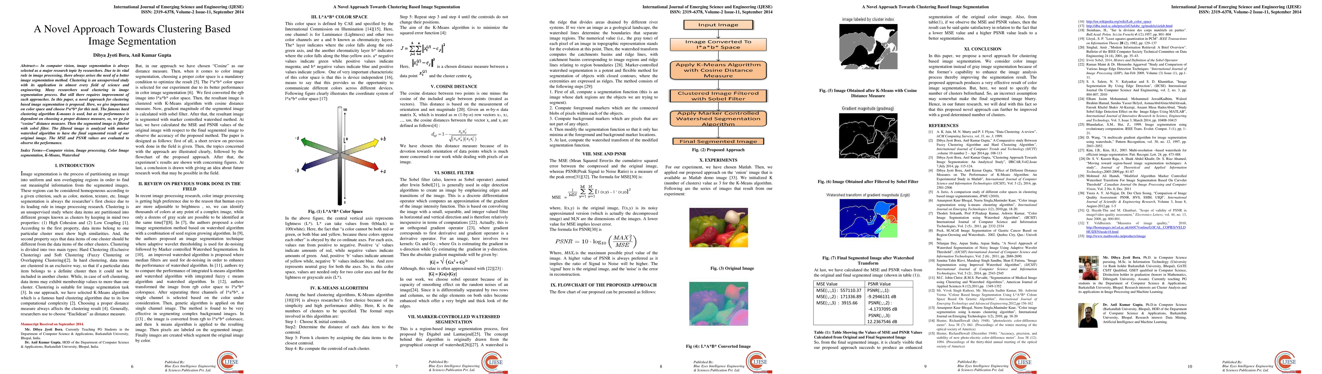 This paper proposes a novel clustering-based image segmentation method using the Lab color space, K-means with cosine distance measure, Sobel filter, and marker watershed algorithm for final segmentation. Performance is evaluated using MSE and PSNR values.