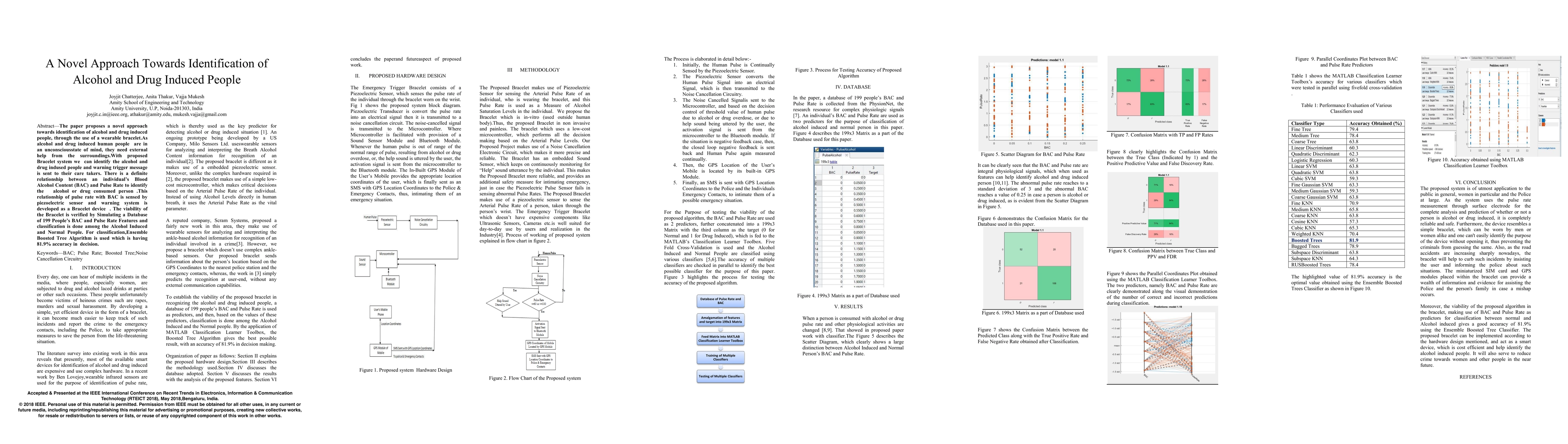 Researchers propose a wearable bracelet system to identify people under the influence of alcohol or drugs, using a piezoelectric sensor to detect pulse rate changes linked to Blood Alcohol Content (BAC). The system achieved 81.9% accuracy in classification through Ensemble Boosted Tree Algorithm.