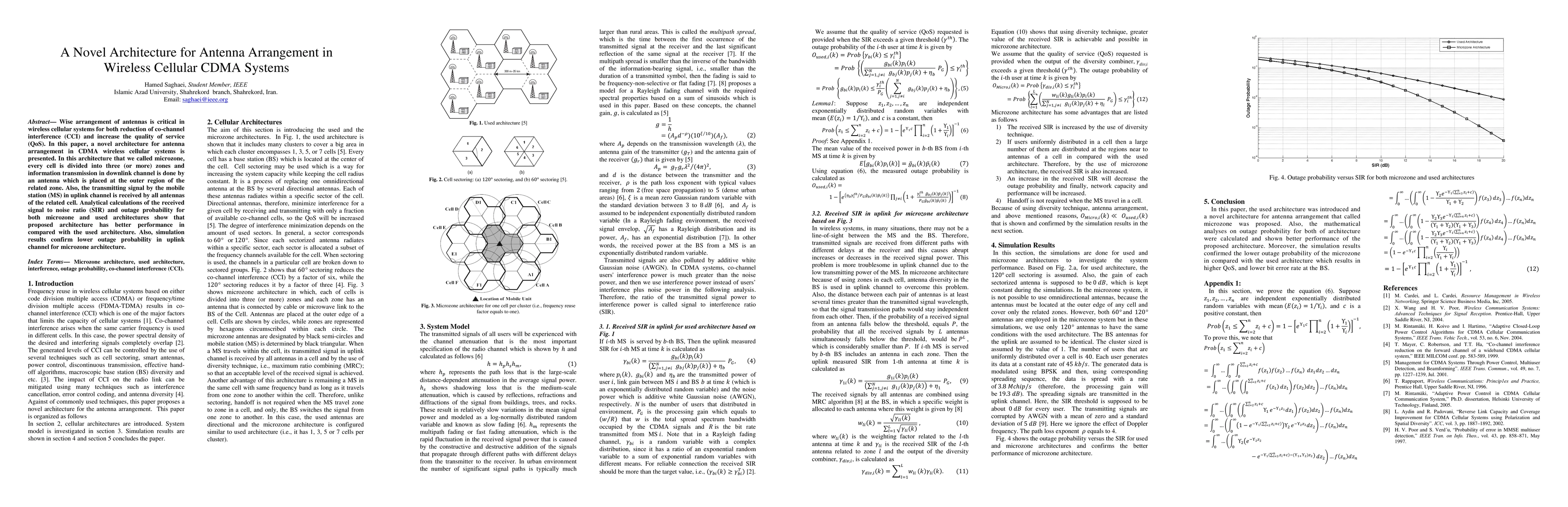 Wise arrangement of antennas is critical in wireless cellular systems for both reduction of co-channel interference (CCI) and increase the quality of service (QoS). In this paper, a novel architecture for antenna arrangement in CDMA wireless cellular systems is presented. In this architecture that we called microzone, every cell is divided into three (or more) zones and information transmission in downlink channel is done by an antenna which is placed at the outer region of the related zone. Also, the transmitting signal by the mobile station (MS) in uplink channel is received by all antennas of the related cell. Analytical calculations of the received signal to noise ratio (SIR) and outage probability for both microzone and used architectures show that proposed architecture has better performance in compared with the used architecture. Also, simulation results confirm lower outage probability in uplink channel for microzone architecture.
