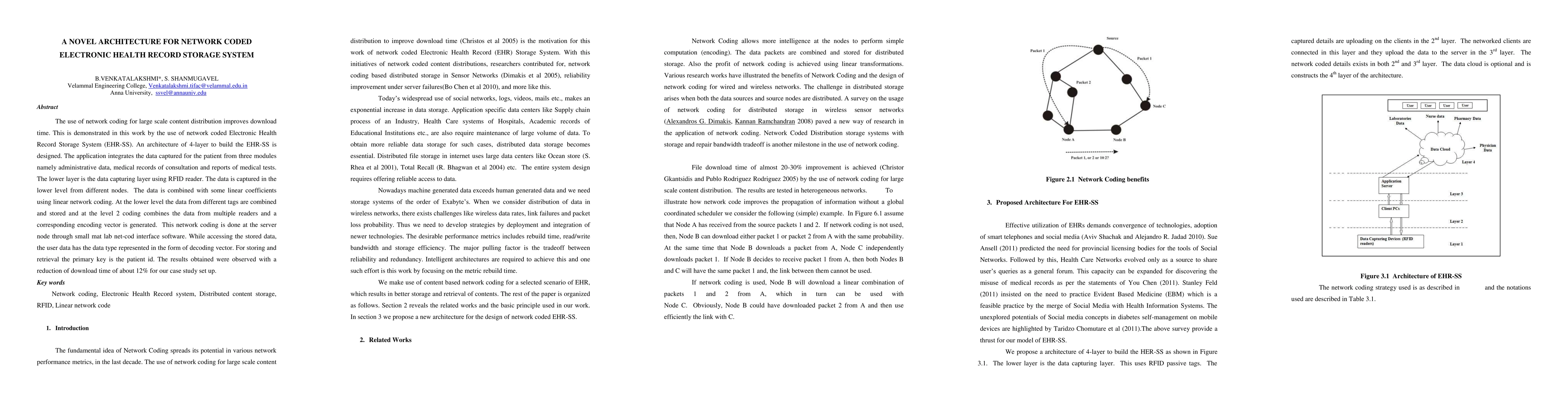 A novel network-coded electronic health record storage system reduces download time by 12% by integrating data from multiple sources with linear coding, offering improved efficiency in large-scale content distribution.