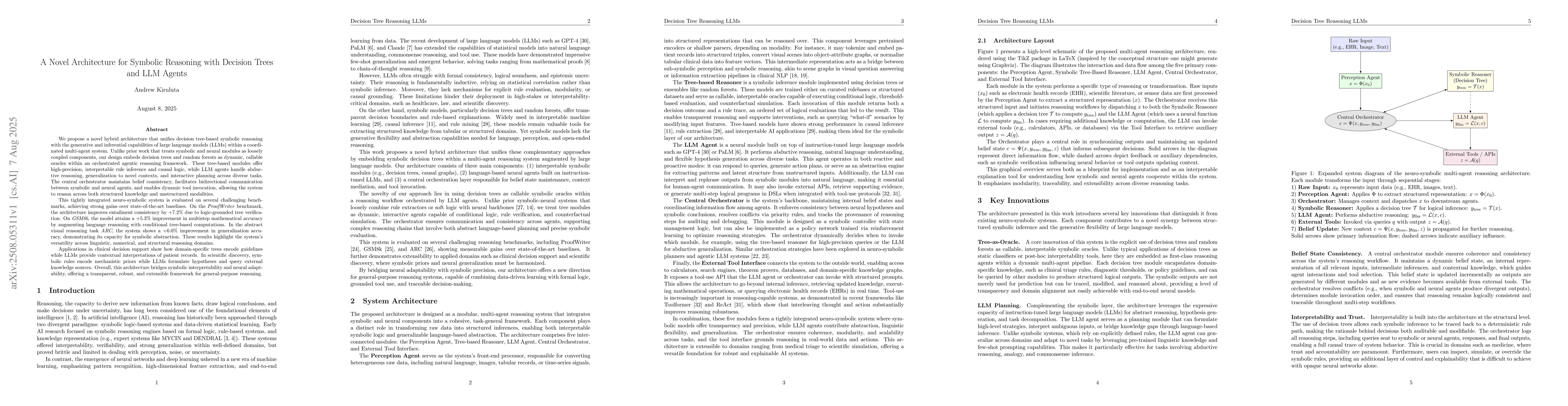 We propose a hybrid architecture that integrates decision tree-based symbolic reasoning with the generative capabilities of large language models (LLMs) within a coordinated multi-agent framework. Unlike prior approaches that loosely couple symbolic and neural modules, our design embeds decision trees and random forests as callable oracles within a unified reasoning system. Tree-based modules enable interpretable rule inference and causal logic, while LLM agents handle abductive reasoning, generalization, and interactive planning. A central orchestrator maintains belief state consistency and mediates communication across agents and external tools, enabling reasoning over both structured and unstructured inputs. The system achieves strong performance on reasoning benchmarks. On \textit{ProofWriter}, it improves entailment consistency by +7.2\% through logic-grounded tree validation. On GSM8k, it achieves +5.3\% accuracy gains in multistep mathematical problems via symbolic augmentation. On \textit{ARC}, it boosts abstraction accuracy by +6.0\% through integration of symbolic oracles. Applications in clinical decision support and scientific discovery show how the system encodes domain rules symbolically while leveraging LLMs for contextual inference and hypothesis generation. This architecture offers a robust, interpretable, and extensible solution for general-purpose neuro-symbolic reasoning.