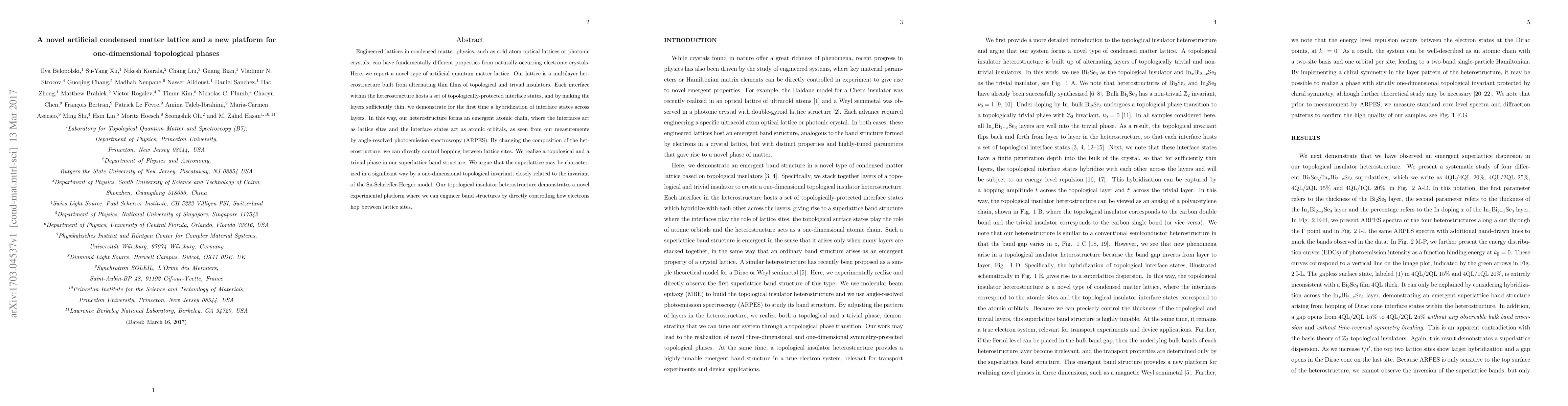 Engineered lattices in condensed matter physics, such as cold atom optical lattices or photonic crystals, can have fundamentally different properties from naturally-occurring electronic crystals. Here, we report a novel type of artificial quantum matter lattice. Our lattice is a multilayer heterostructure built from alternating thin films of topological and trivial insulators. Each interface within the heterostructure hosts a set of topologically-protected interface states, and by making the layers sufficiently thin, we demonstrate for the first time a hybridization of interface states across layers. In this way, our heterostructure forms an emergent atomic chain, where the interfaces act as lattice sites and the interface states act as atomic orbitals, as seen from our measurements by angle-resolved photoemission spectroscopy (ARPES). By changing the composition of the heterostructure, we can directly control hopping between lattice sites. We realize a topological and a trivial phase in our superlattice band structure. We argue that the superlattice may be characterized in a significant way by a one-dimensional topological invariant, closely related to the invariant of the Su-Schrieffer-Heeger model. Our topological insulator heterostructure demonstrates a novel experimental platform where we can engineer band structures by directly controlling how electrons hop between lattice sites.