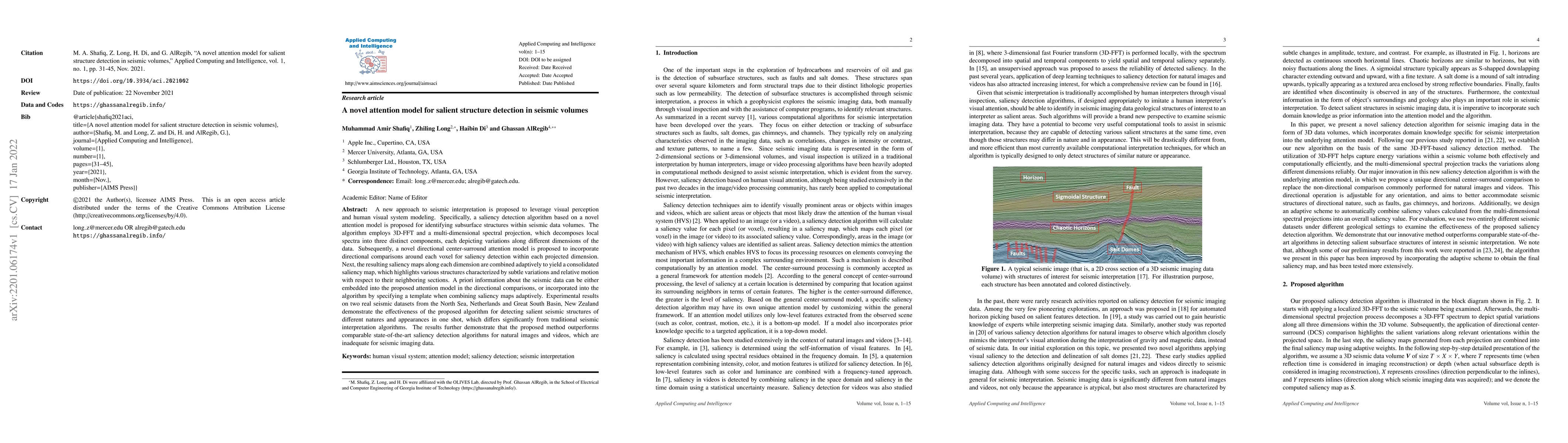 A new approach to seismic interpretation is proposed to leverage visual perception and human visual system modeling. Specifically, a saliency detection algorithm based on a novel attention model is proposed for identifying subsurface structures within seismic data volumes. The algorithm employs 3D-FFT and a multi-dimensional spectral projection, which decomposes local spectra into three distinct components, each depicting variations along different dimensions of the data. Subsequently, a novel directional center-surround attention model is proposed to incorporate directional comparisons around each voxel for saliency detection within each projected dimension. Next, the resulting saliency maps along each dimension are combined adaptively to yield a consolidated saliency map, which highlights various structures characterized by subtle variations and relative motion with respect to their neighboring sections. A priori information about the seismic data can be either embedded into the proposed attention model in the directional comparisons, or incorporated into the algorithm by specifying a template when combining saliency maps adaptively. Experimental results on two real seismic datasets from the North Sea, Netherlands and Great South Basin, New Zealand demonstrate the effectiveness of the proposed algorithm for detecting salient seismic structures of different natures and appearances in one shot, which differs significantly from traditional seismic interpretation algorithms. The results further demonstrate that the proposed method outperforms comparable state-of-the-art saliency detection algorithms for natural images and videos, which are inadequate for seismic imaging data.