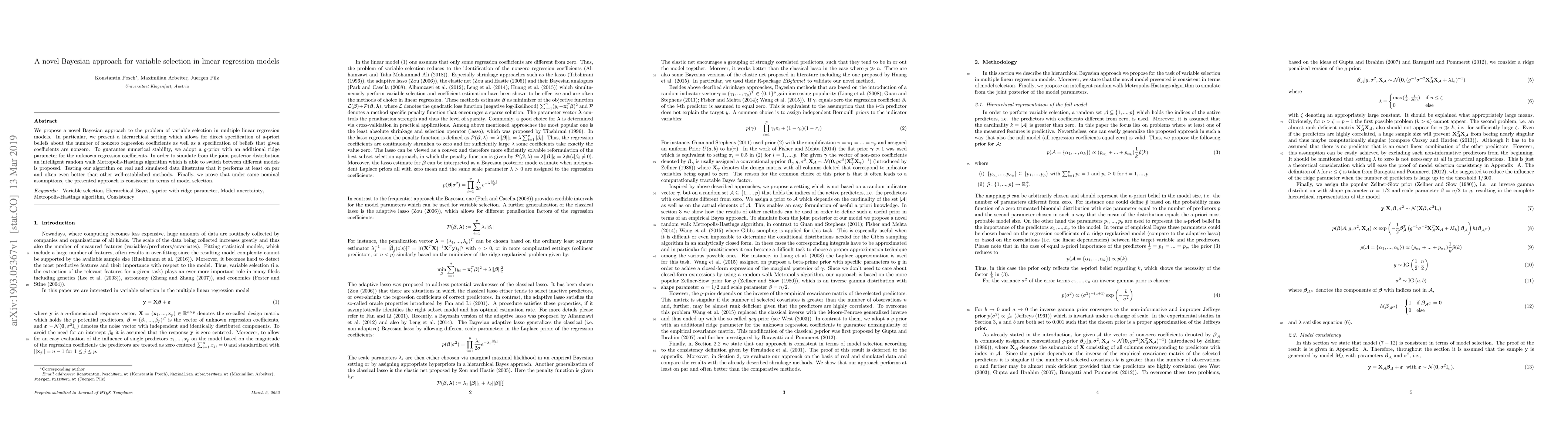 We propose a novel Bayesian approach to the problem of variable selection in multiple linear regression models. In particular, we present a hierarchical setting which allows for direct specification of a-priori beliefs about the number of nonzero regression coefficients as well as a specification of beliefs that given coefficients are nonzero. To guarantee numerical stability, we adopt a $g$-prior with an additional ridge parameter for the unknown regression coefficients. In order to simulate from the joint posterior distribution an intelligent random walk Metropolis-Hastings algorithm which is able to switch between different models is proposed. Testing our algorithm on real and simulated data illustrates that it performs at least on par and often even better than other well-established methods. Finally, we prove that under some nominal assumptions, the presented approach is consistent in terms of model selection.