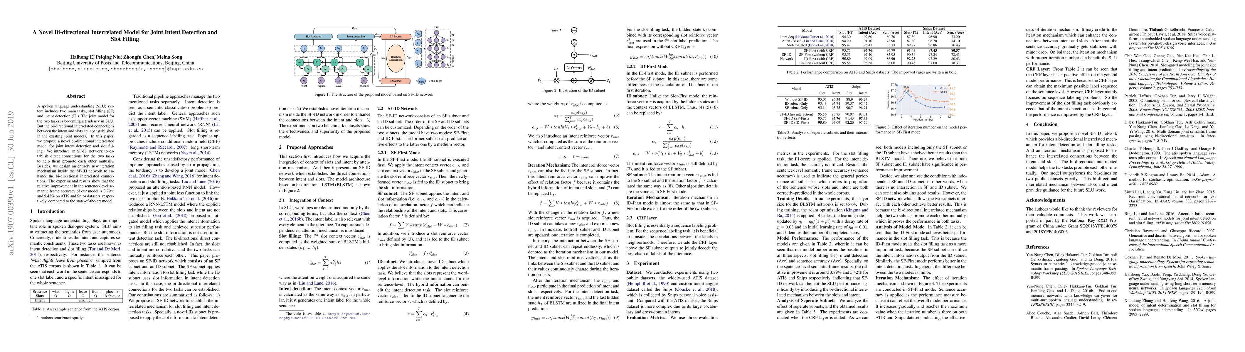This paper proposes a novel bi-directional interrelated model for joint intent detection and slot filling, introducing an SF-ID network with an iteration mechanism to enhance mutual promotion between the tasks. Experimental results show significant improvements in semantic frame accuracy on ATIS and Snips datasets.
