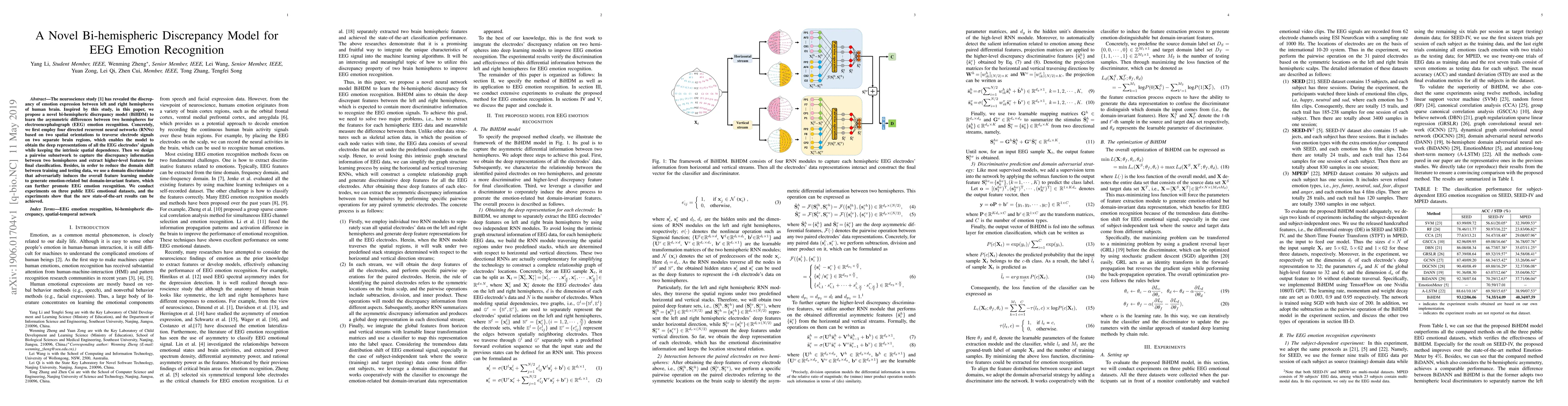 This paper proposes a novel bi-hemispheric discrepancy model (BiHDM) for EEG emotion recognition, leveraging asymmetric differences between brain hemispheres. The model uses directed RNNs to capture spatial dependencies and a pairwise subnetwork to extract hemispheric discrepancy features, achieving state-of-the-art results on three public datasets.