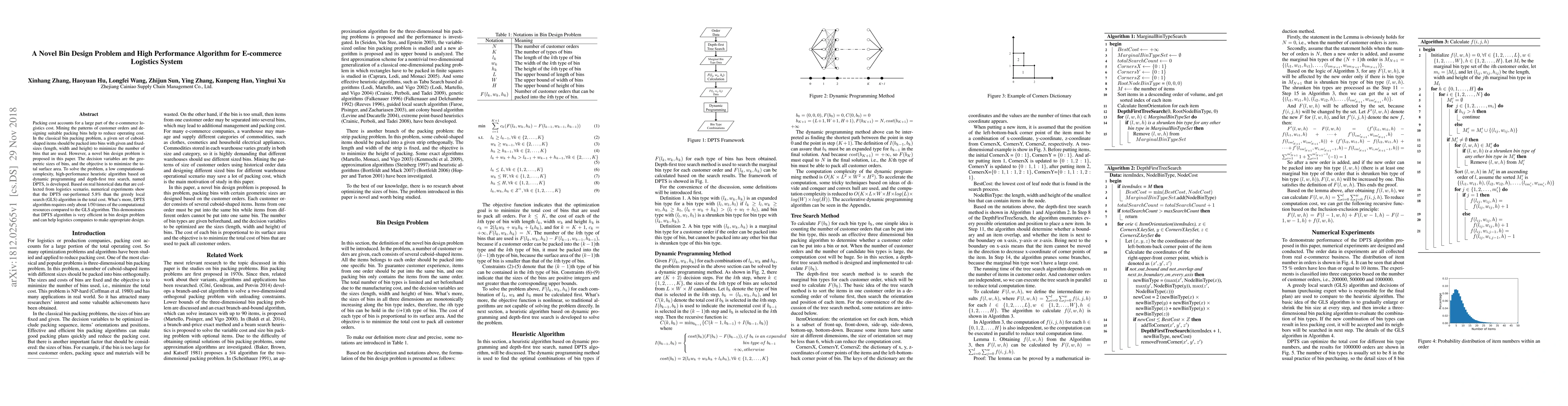 Packing cost accounts for a large part of the e-commerce logistics cost. Mining the patterns of customer orders and designing suitable packing bins help to reduce operating cost. In the classical bin packing problem, a given set of cuboid-shaped items should be packed into bins with given and fixed-sizes (length, width and height) to minimize the number of bins that are used. However, a novel bin design problem is proposed in this paper. The decision variables are the geometric sizes of bins, and the objective is to minimize the total surface area. To solve the problem, a low computational-complexity, high-performance heuristic algorithm based on dynamic programming and depth-first tree search, named DPTS, is developed. Based on real historical data that are collected from logistics scenario, numerical experiments show that the DPTS out-performed 5.8% than the greedy local search (GLS) algorithm in the total cost. What's more, DPTS algorithm requires only about 1/50 times of the computational resources compared to the GLS algorithm. This demonstrates that DPTS algorithm is very efficient in bin design problem and can help logistics companies to make appropriate design.