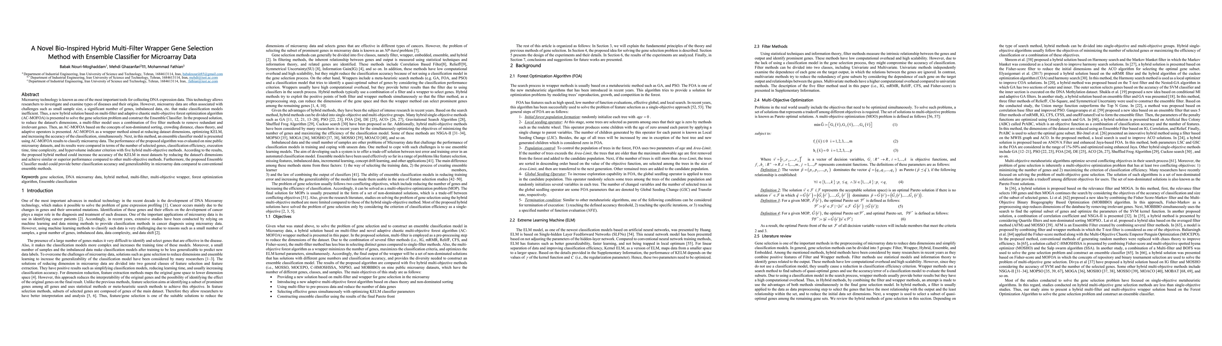 Microarray technology is known as one of the most important tools for collecting DNA expression data. This technology allows researchers to investigate and examine types of diseases and their origins. However, microarray data are often associated with challenges such as small sample size, a significant number of genes, imbalanced data, etc. that make classification models inefficient. Thus, a new hybrid solution based on multi-filter and adaptive chaotic multi-objective forest optimization algorithm (AC-MOFOA) is presented to solve the gene selection problem and construct the Ensemble Classifier. In the proposed solution, to reduce the dataset's dimensions, a multi-filter model uses a combination of five filter methods to remove redundant and irrelevant genes. Then, an AC-MOFOA based on the concepts of non-dominated sorting, crowding distance, chaos theory, and adaptive operators is presented. AC-MOFOA as a wrapper method aimed at reducing dataset dimensions, optimizing KELM, and increasing the accuracy of the classification, simultaneously. Next, in this method, an ensemble classifier model is presented using AC-MOFOA results to classify microarray data. The performance of the proposed algorithm was evaluated on nine public microarray datasets, and its results were compared in terms of the number of selected genes, classification efficiency, execution time, time complexity, and hypervolume indicator criterion with five hybrid multi-objective methods. According to the results, the proposed hybrid method could increase the accuracy of the KELM in most datasets by reducing the dataset's dimensions and achieve similar or superior performance compared to other multi-objective methods. Furthermore, the proposed Ensemble Classifier model could provide better classification accuracy and generalizability in microarray data compared to conventional ensemble methods.