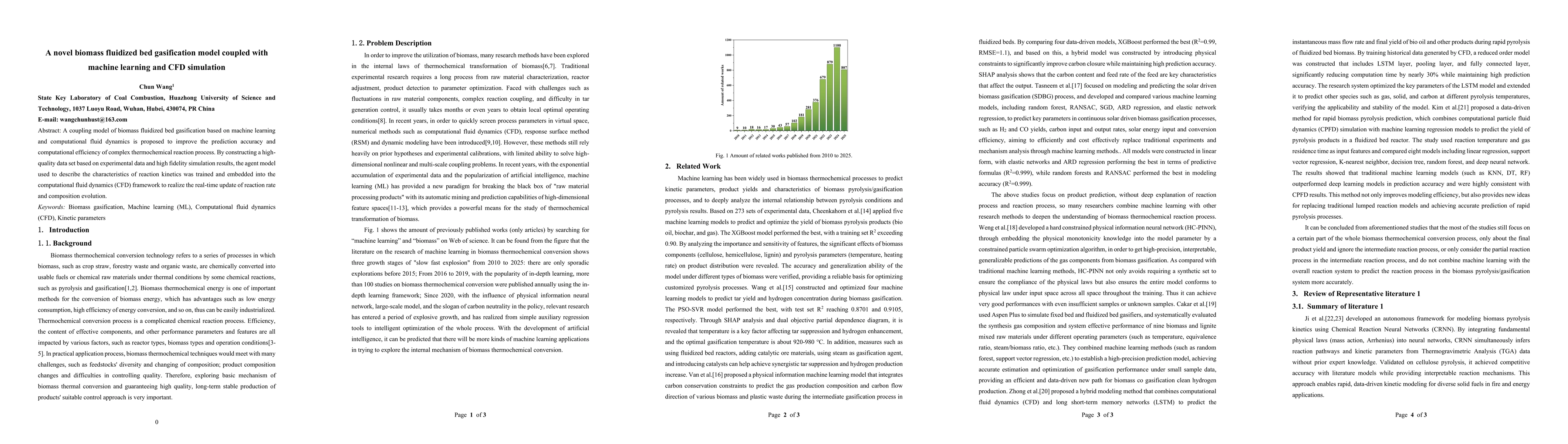 A coupling model of biomass fluidized bed gasification based on machine learning and computational fluid dynamics is proposed to improve the prediction accuracy and computational efficiency of complex thermochemical reaction process. By constructing a high-quality data set based on experimental data and high fidelity simulation results, the agent model used to describe the characteristics of reaction kinetics was trained and embedded into the computational fluid dynamics (CFD) framework to realize the real-time update of reaction rate and composition evolution.