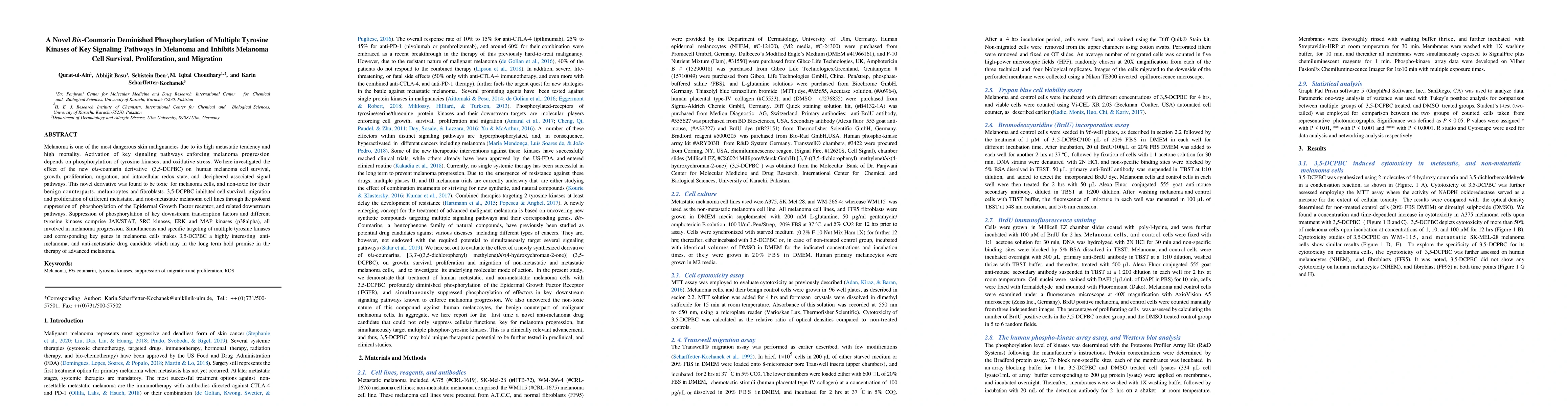 This study investigates a novel bis-coumarin derivative (3,5-DCPBC) that targets multiple tyrosine kinases in melanoma, inhibiting cell survival, proliferation, and migration. It shows selective toxicity towards melanoma cells without affecting benign cells, suggesting potential as an effective anti-melanoma therapy.