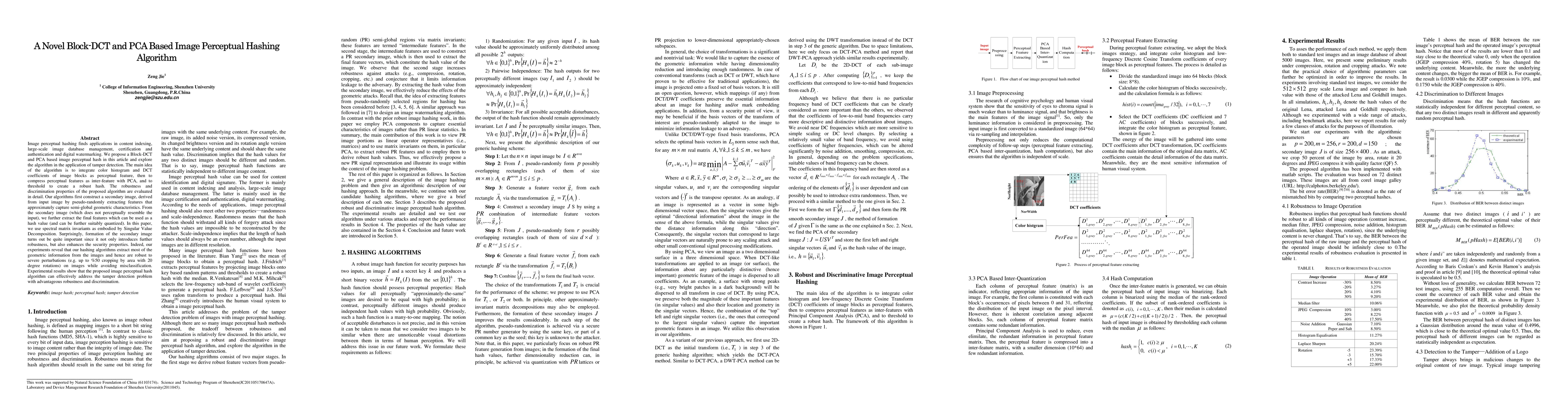 This paper proposes a novel image perceptual hashing algorithm based on Block-DCT and PCA for tamper detection. The algorithm integrates color histograms and DCT coefficients, compresses features with PCA, and forms a robust hash, demonstrating strong robustness to severe image perturbations while maintaining high discrimination.
