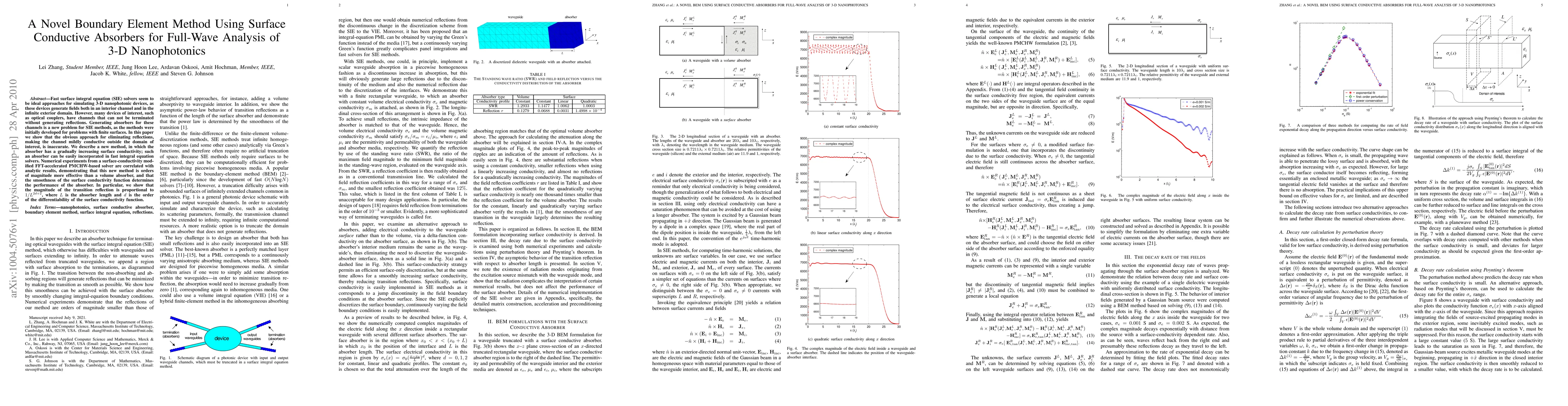 Fast surface integral equation (SIE) solvers seem to be ideal approaches for simulating 3-D nanophotonic devices, as these devices generate fields both in an interior channel and in the infinite exterior domain. However, many devices of interest, such as optical couplers, have channels that can not be terminated without generating reflections. Generating absorbers for these channels is a new problem for SIE methods, as the methods were initially developed for problems with finite surfaces. In this paper we show that the obvious approach for eliminating reflections, making the channel mildly conductive outside the domain of interest, is inaccurate. We describe a new method, in which the absorber has a gradually increasing surface conductivity; such an absorber can be easily incorporated in fast integral equation solvers. Numerical experiments from a surface-conductivity modified FFT-accelerated PMCHW-based solver are correlated with analytic results, demonstrating that this new method is orders of magnitude more effective than a volume absorber, and that the smoothness of the surface conductivity function determines the performance of the absorber. In particular, we show that the magnitude of the transition reflection is proportional to 1/L^(2d+2), where L is the absorber length and d is the order of the differentiability of the surface conductivity function.