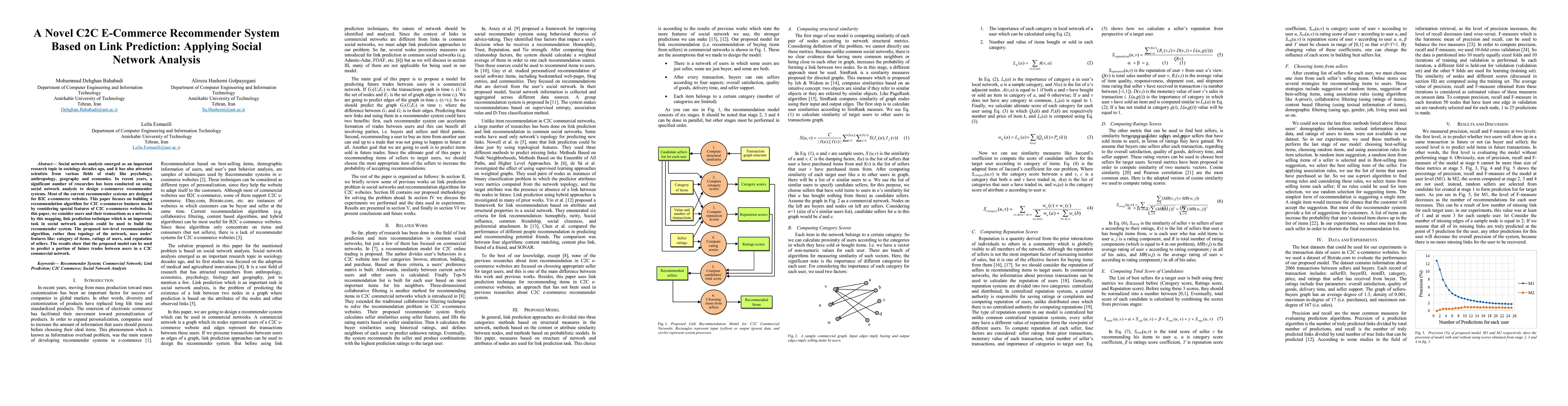 This paper proposes a novel C2C e-commerce recommender system using link prediction based on social network analysis. The two-level algorithm leverages node features like item categories, user ratings, and seller reputation, demonstrating effective prediction of future trades in C2C networks.