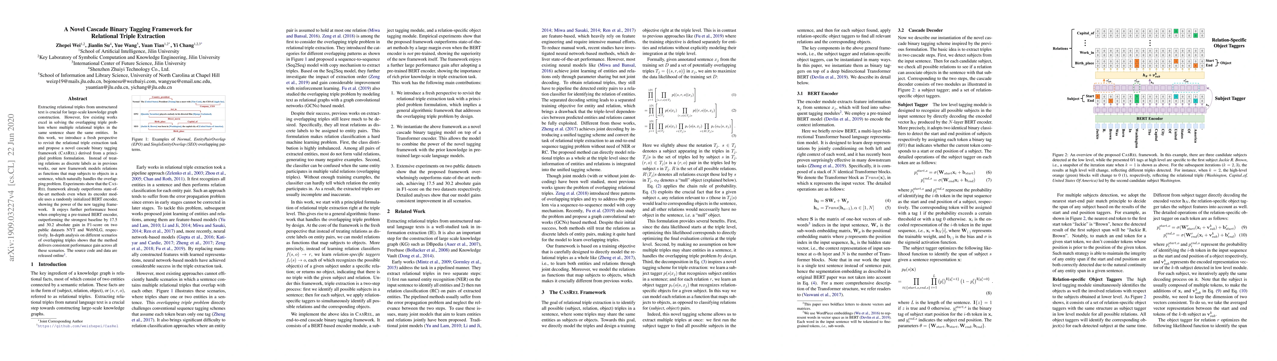 This paper introduces a novel cascade binary tagging framework (CasRel) for extracting relational triples from unstructured text, addressing the challenge of overlapping triples. Unlike previous methods, CasRel models relations as functions mapping subjects to objects, effectively handling overlapping triples. Experimental results show significant improvements over state-of-the-art methods, especially when using a pre-trained BERT encoder, demonstrating the effectiveness of the proposed framework.