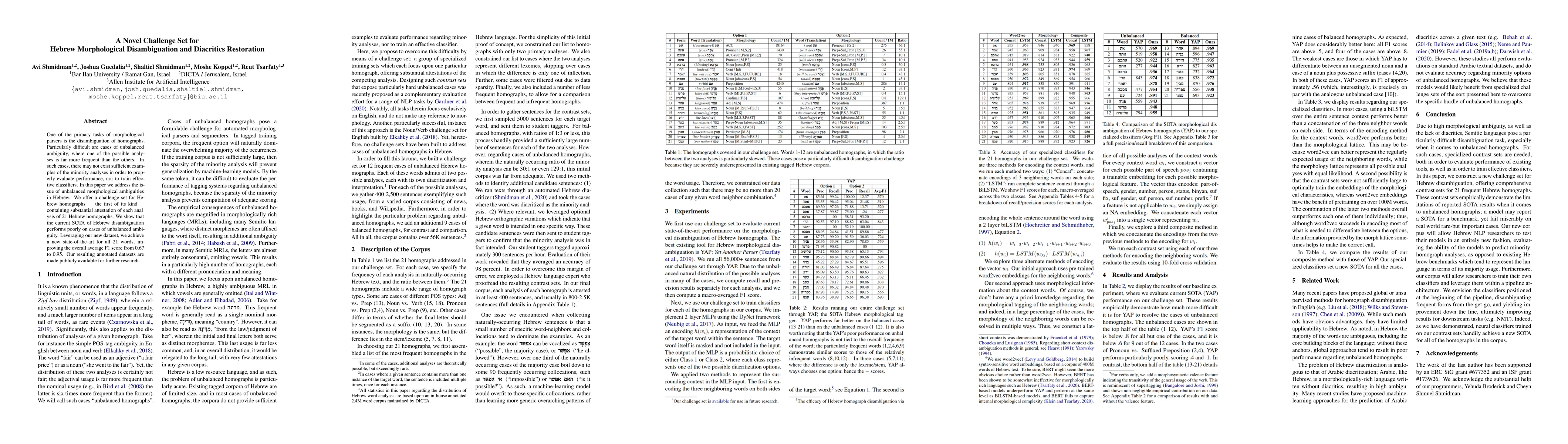 One of the primary tasks of morphological parsers is the disambiguation of homographs. Particularly difficult are cases of unbalanced ambiguity, where one of the possible analyses is far more frequent than the others. In such cases, there may not exist sufficient examples of the minority analyses in order to properly evaluate performance, nor to train effective classifiers. In this paper we address the issue of unbalanced morphological ambiguities in Hebrew. We offer a challenge set for Hebrew homographs -- the first of its kind -- containing substantial attestation of each analysis of 21 Hebrew homographs. We show that the current SOTA of Hebrew disambiguation performs poorly on cases of unbalanced ambiguity. Leveraging our new dataset, we achieve a new state-of-the-art for all 21 words, improving the overall average F1 score from 0.67 to 0.95. Our resulting annotated datasets are made publicly available for further research.