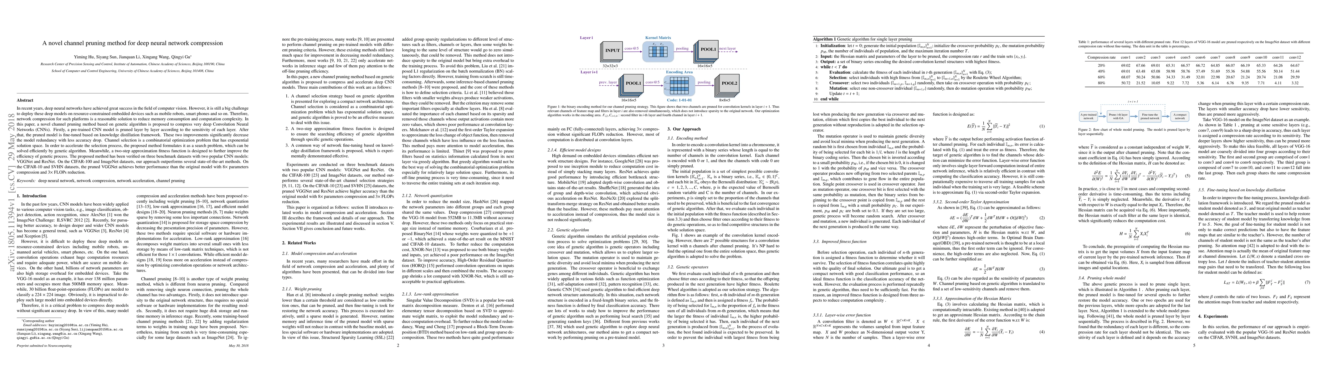 This paper proposes a novel channel pruning method using a genetic algorithm for compressing deep Convolutional Neural Networks (CNNs) to deploy on resource-constrained devices. The method prunes layers based on sensitivity and fine-tunes the model via knowledge distillation, achieving significant reduction in model size with minimal loss in accuracy.