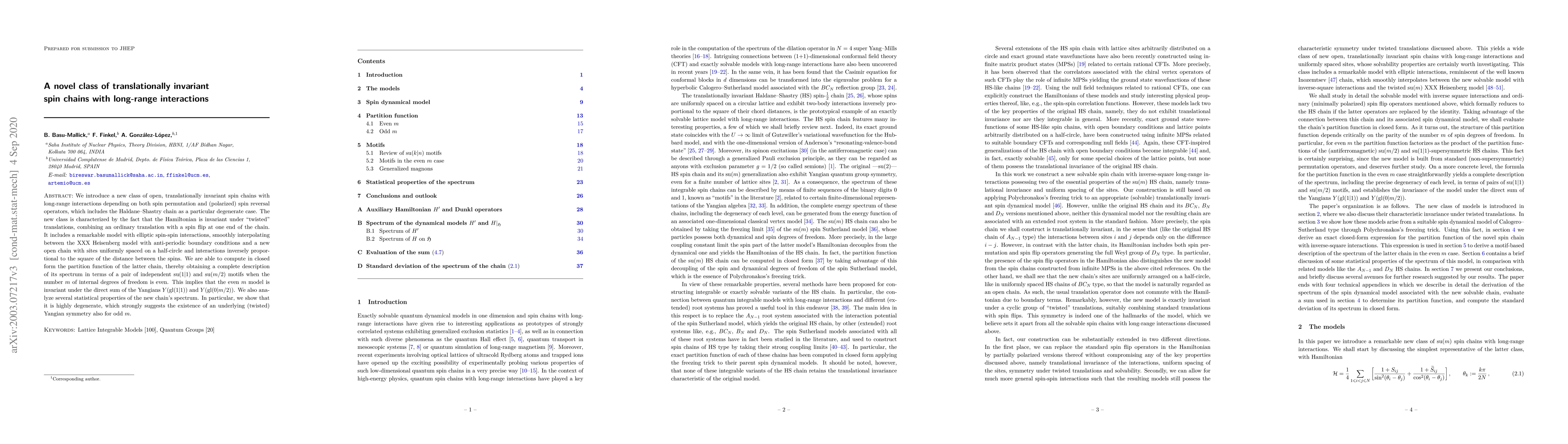 We introduce a new class of open, translationally invariant spin chains with long-range interactions depending on both spin permutation and (polarized) spin reversal operators, which includes the Haldane-Shastry chain as a particular degenerate case. The new class is characterized by the fact that the Hamiltonian is invariant under "twisted" translations, combining an ordinary translation with a spin flip at one end of the chain. It includes a remarkable model with elliptic spin-spin interactions, smoothly interpolating between the XXX Heisenberg model with anti-periodic boundary conditions and a new open chain with sites uniformly spaced on a half-circle and interactions inversely proportional to the square of the distance between the spins. We are able to compute in closed form the partition function of the latter chain, thereby obtaining a complete description of its spectrum in terms of a pair of independent su(1|1) and ${\rm su}(m/2)$ motifs when the number $m$ of internal degrees of freedom is even. This implies that the even $m$ model is invariant under the direct sum of the Yangians $Y$(gl(1|1)) and $Y$(gl$(0|m/2)$). We also analyze several statistical properties of the new chain's spectrum. In particular, we show that it is highly degenerate, which strongly suggests the existence of an underlying (twisted) Yangian symmetry also for odd $m$.