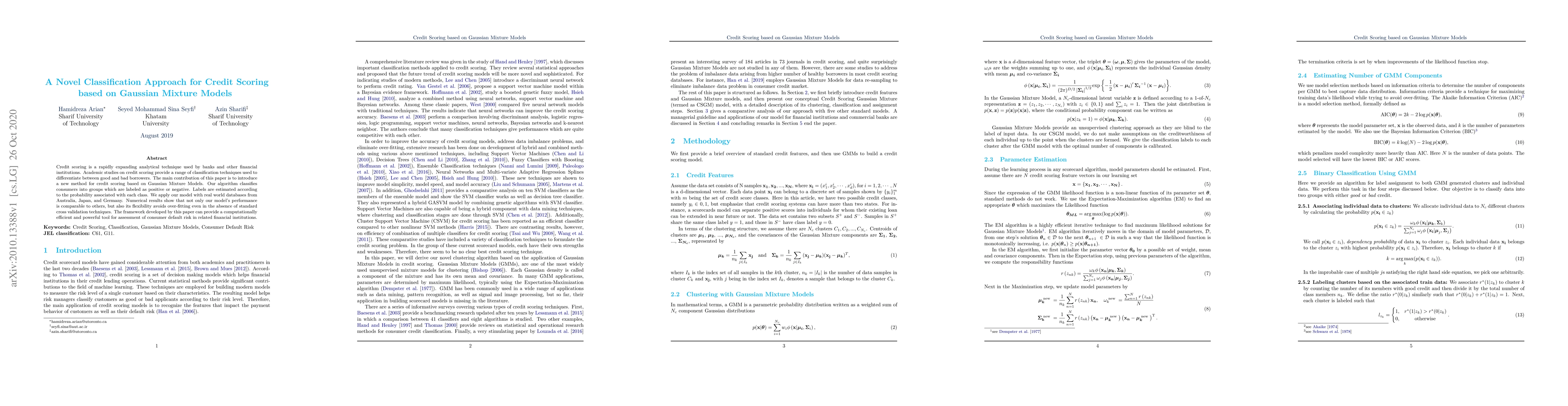 Credit scoring is a rapidly expanding analytical technique used by banks and other financial institutions. Academic studies on credit scoring provide a range of classification techniques used to differentiate between good and bad borrowers. The main contribution of this paper is to introduce a new method for credit scoring based on Gaussian Mixture Models. Our algorithm classifies consumers into groups which are labeled as positive or negative. Labels are estimated according to the probability associated with each class. We apply our model with real world databases from Australia, Japan, and Germany. Numerical results show that not only our model's performance is comparable to others, but also its flexibility avoids over-fitting even in the absence of standard cross validation techniques. The framework developed by this paper can provide a computationally efficient and powerful tool for assessment of consumer default risk in related financial institutions.
