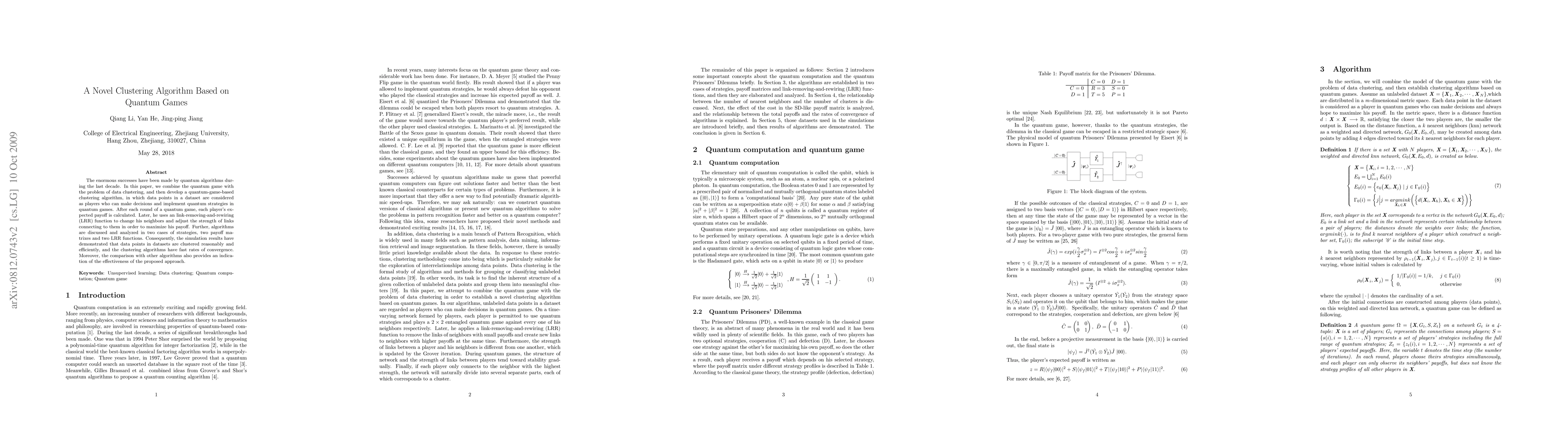 Enormous successes have been made by quantum algorithms during the last decade. In this paper, we combine the quantum game with the problem of data clustering, and then develop a quantum-game-based clustering algorithm, in which data points in a dataset are considered as players who can make decisions and implement quantum strategies in quantum games. After each round of a quantum game, each player's expected payoff is calculated. Later, he uses a link-removing-and-rewiring (LRR) function to change his neighbors and adjust the strength of links connecting to them in order to maximize his payoff. Further, algorithms are discussed and analyzed in two cases of strategies, two payoff matrixes and two LRR functions. Consequently, the simulation results have demonstrated that data points in datasets are clustered reasonably and efficiently, and the clustering algorithms have fast rates of convergence. Moreover, the comparison with other algorithms also provides an indication of the effectiveness of the proposed approach.