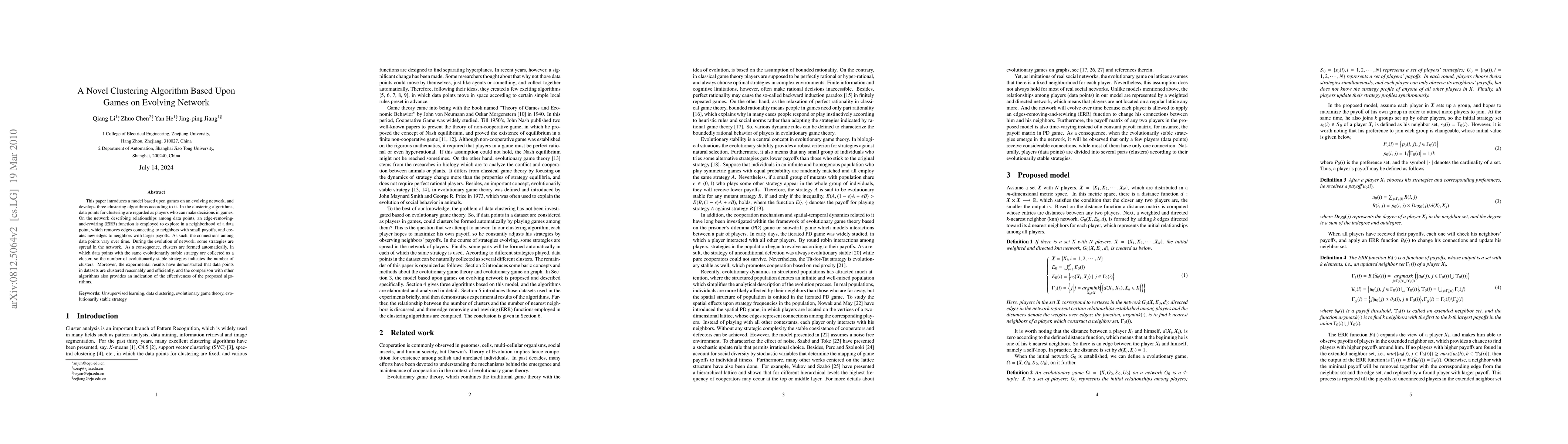 This paper introduces a model based upon games on an evolving network, and develops three clustering algorithms according to it. In the clustering algorithms, data points for clustering are regarded as players who can make decisions in games. On the network describing relationships among data points, an edge-removing-and-rewiring (ERR) function is employed to explore in a neighborhood of a data point, which removes edges connecting to neighbors with small payoffs, and creates new edges to neighbors with larger payoffs. As such, the connections among data points vary over time. During the evolution of network, some strategies are spread in the network. As a consequence, clusters are formed automatically, in which data points with the same evolutionarily stable strategy are collected as a cluster, so the number of evolutionarily stable strategies indicates the number of clusters. Moreover, the experimental results have demonstrated that data points in datasets are clustered reasonably and efficiently, and the comparison with other algorithms also provides an indication of the effectiveness of the proposed algorithms.