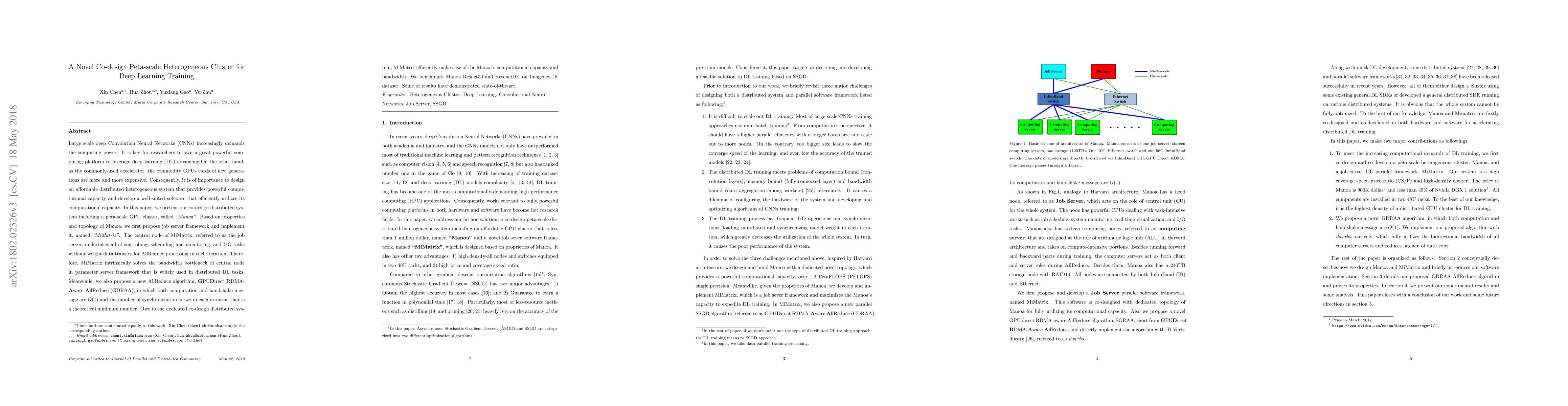 Large scale deep Convolution Neural Networks (CNNs) increasingly demands the computing power. It is key for researchers to own a great powerful computing platform to leverage deep learning (DL) advancing.On the other hand, as the commonly-used accelerator, the commodity GPUs cards of new generations are more and more expensive. Consequently, it is of importance to design an affordable distributed heterogeneous system that provides powerful computational capacity and develop a well-suited software that efficiently utilizes its computational capacity. In this paper, we present our co-design distributed system including a peta-scale GPU cluster, called "Manoa". Based on properties and topology of Manoa, we first propose job server framework and implement it, named "MiMatrix". The central node of MiMatrix, referred to as the job server, undertakes all of controlling, scheduling and monitoring, and I/O tasks without weight data transfer for AllReduce processing in each iteration. Therefore, MiMatrix intrinsically solves the bandwidth bottleneck of central node in parameter server framework that is widely used in distributed DL tasks. Meanwhile, we also propose a new AllReduce algorithm, GPUDirect RDMA-Aware AllReduce~(GDRAA), in which both computation and handshake message are O(1) and the number of synchronization is two in each iteration that is a theoretical minimum number. Owe to the dedicated co-design distributed system, MiMatrix efficiently makes use of the Manoa's computational capacity and bandwidth. We benchmark Manoa Resnet50 and Resenet101 on Imagenet-1K dataset. Some of results have demonstrated state-of-the-art.