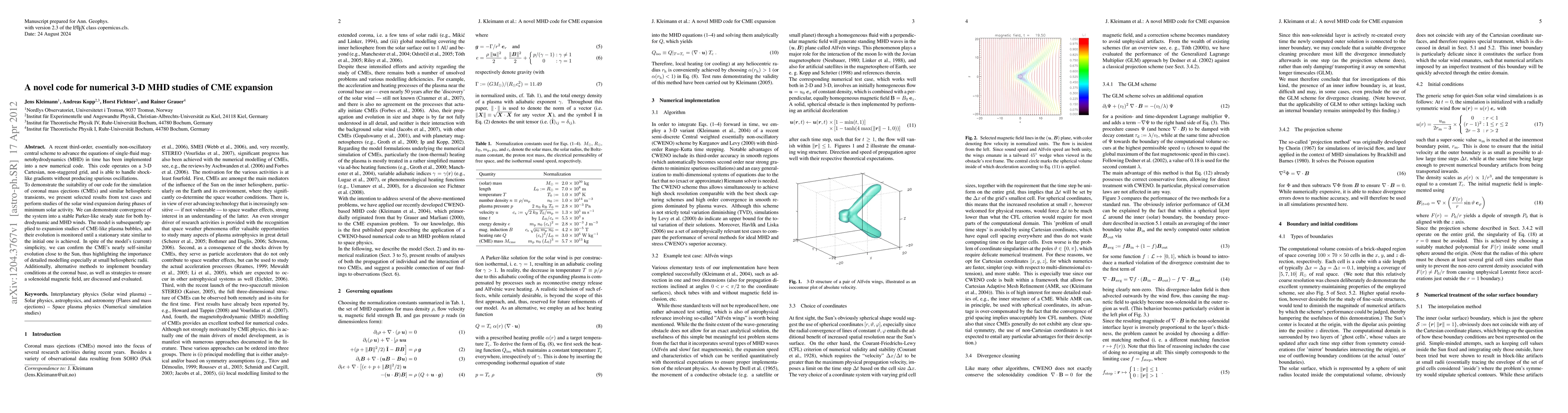 A recent third-order, essentially non-oscillatory central scheme to advance the equations of single-fluid magnetohydrodynamics (MHD) in time has been implemented into a new numerical code. This code operates on a 3-D Cartesian, non-staggered grid, and is able to handle shock-like gradients without producing spurious oscillations. To demonstrate the suitability of our code for the simulation of coronal mass ejections (CMEs) and similar heliospheric transients, we present selected results from test cases and perform studies of the solar wind expansion during phases of minimum solar activity. We can demonstrate convergence of the system into a stable Parker-like steady state for both hydrodynamic and MHD winds. The model is subsequently applied to expansion studies of CME-like plasma bubbles, and their evolution is monitored until a stationary state similar to the initial one is achieved. In spite of the model's (current) simplicity, we can confirm the CME's nearly self-similar evolution close to the Sun, thus highlighting the importance of detailed modelling especially at small heliospheric radii. Additionally, alternative methods to implement boundary conditions at the coronal base, as well as strategies to ensure a solenoidal magnetic field, are discussed and evaluated.
