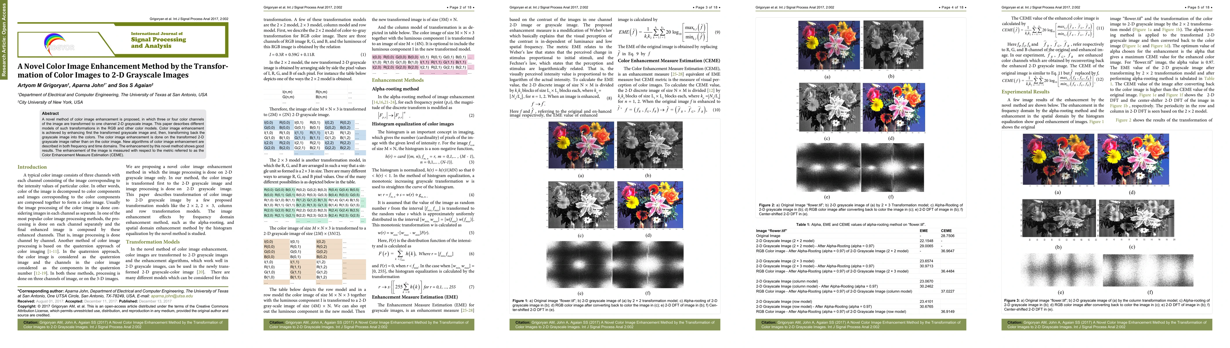This paper proposes a novel method for color image enhancement by transforming color channels into a 2-D grayscale image, enhancing it, and then converting it back to color. The method shows good results, measured by the Color Enhancement Measure Estimation (CEME).