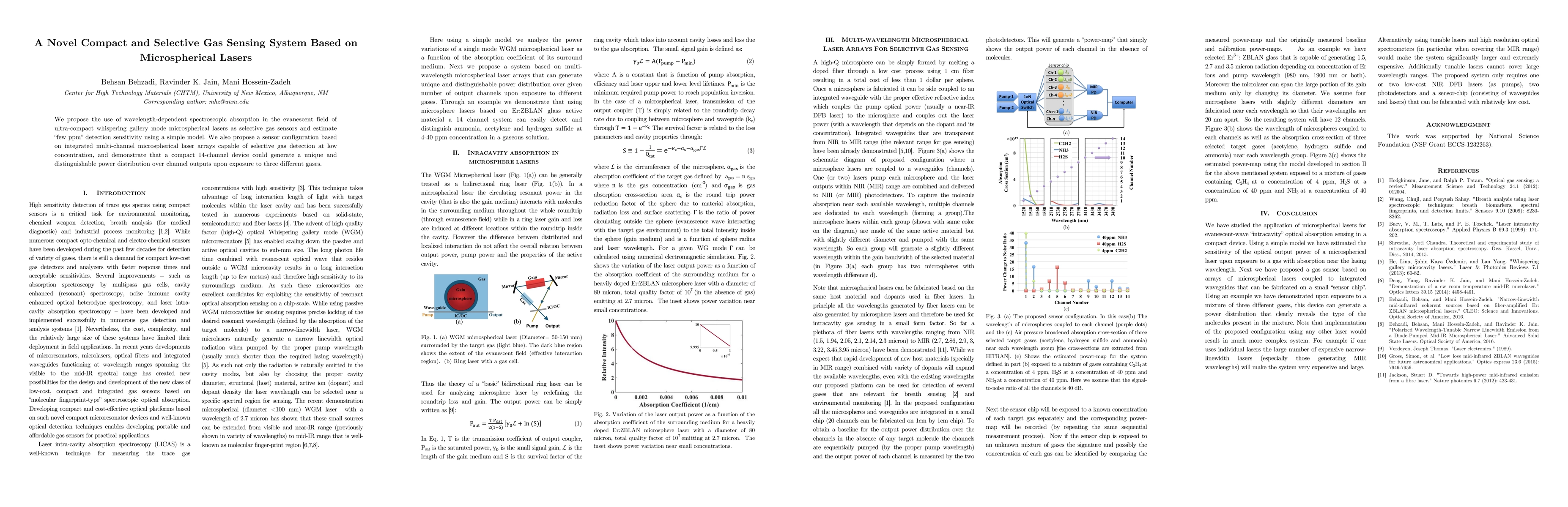 We propose the use of wavelength-dependent spectroscopic absorption in the evanescent field of ultra-compact whispering gallery mode microspherical lasers as selective gas sensors and estimate few ppm detection sensitivity using a simple model. We also propose a sensor configuration based on integrated multi-channel microspherical laser arrays capable of selective gas detection at low concentration, and demonstrate that a compact 14channel device could generate a unique and distinguishable power distribution over channel outputs upon exposure to three different gases.
