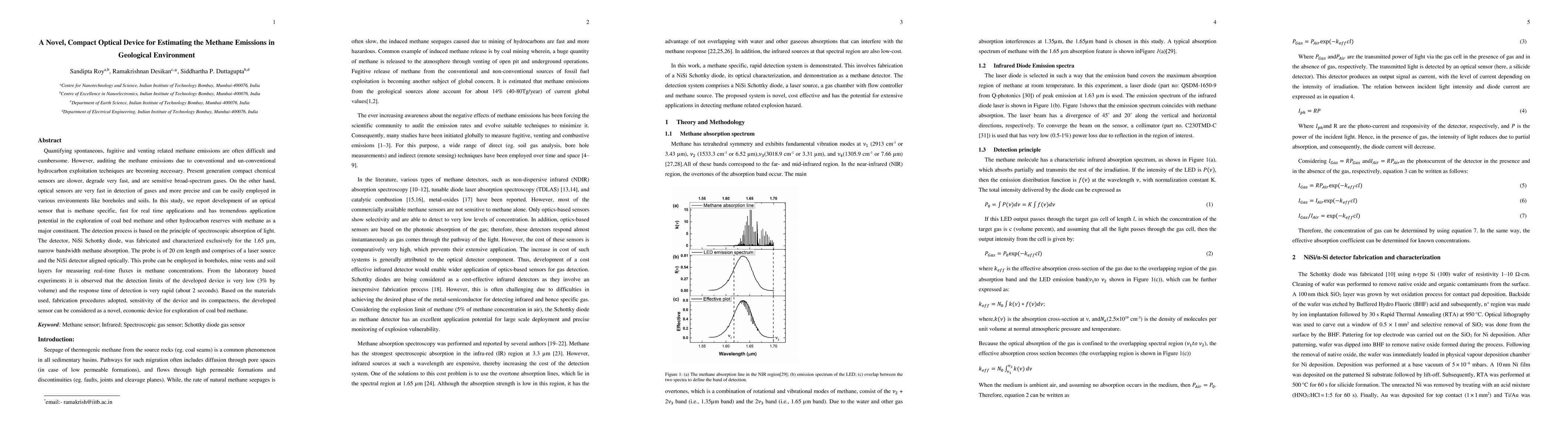This paper presents a novel, compact optical sensor designed for precise, real-time detection of methane emissions in geological environments. The device, based on spectroscopic absorption, features a NiSi Schottky diode and a laser source, achieving low detection limits and rapid response times, making it ideal for coal bed methane exploration.