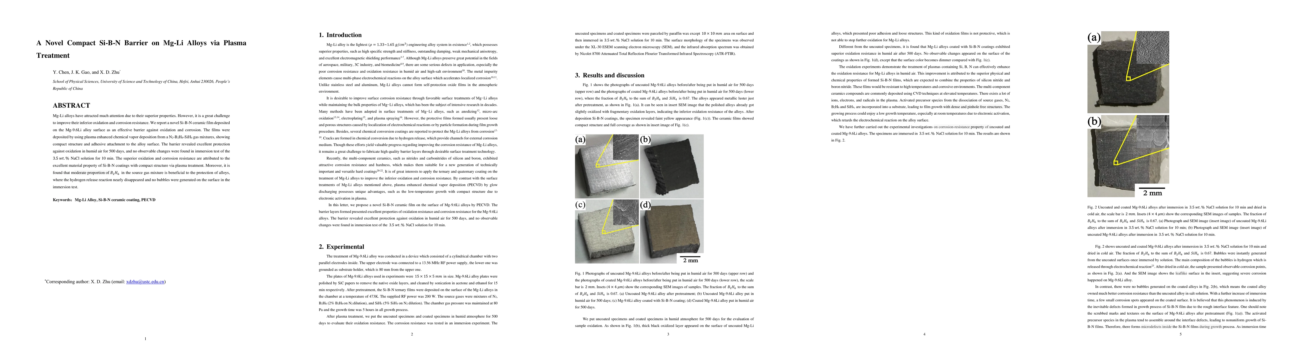 This research introduces a new Si-B-N coating method using plasma treatment to enhance the oxidation and corrosion resistance of Mg-Li alloys. The coating, applied via plasma-enhanced chemical vapor deposition, showed compactness and strong adhesion, providing excellent protection against oxidation in humid air for 500 days and resistance to 3.5 wt.% NaCl solution immersion for 10 minutes. The coating's success is attributed to its material properties and the beneficial role of B_2H_6 in the gas mixture, which suppresses hydrogen release and bubble formation on the surface.
