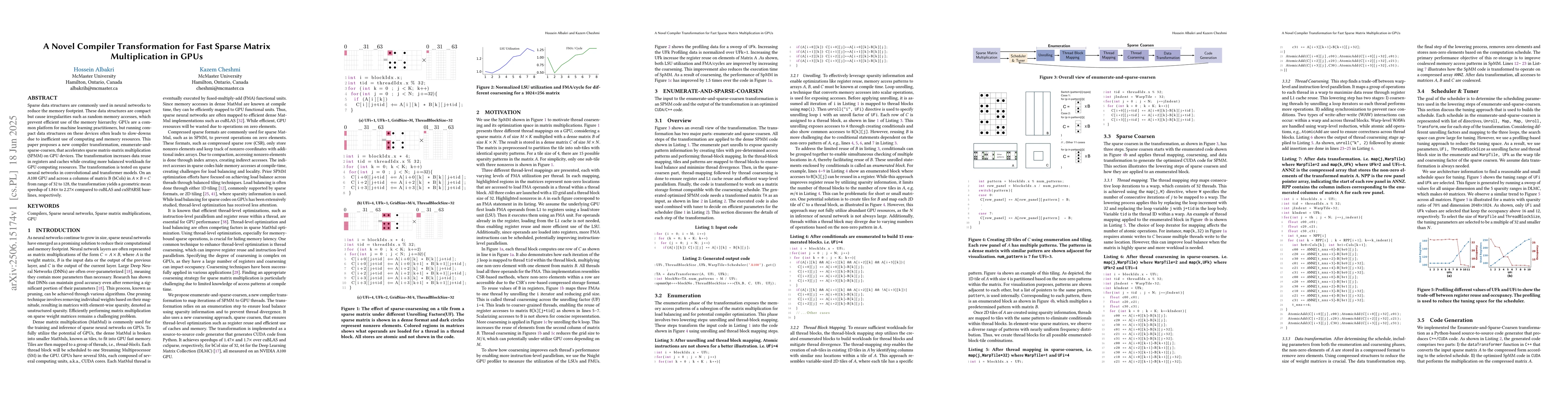Sparse data structures are commonly used in neural networks to reduce the memory footprint. These data structures are compact but cause irregularities such as random memory accesses, which prevent efficient use of the memory hierarchy. GPUs are a common platform for machine learning practitioners, but running compact data structures on these devices often leads to slow-downs due to inefficient use of computing and memory resources. This paper proposes a new compiler transformation, enumerate-and-sparse-coarsen, that accelerates sparse matrix-matrix multiplication (SPMM) on GPU devices. The transformation increases data reuse in registers and caches while creating more balanced workloads for GPU computing resources. The transformation is tested on sparse neural networks in convolutional and transformer models. On an A100 GPU and across a columns of matrix B (bCols) in $ A \times B = C$ from range of 32 to 128, the transformation yields a geometric mean speedup of 1.84$\times$ to 2.27$\times$ compared to cuBLAS and cuSPARSE baselines, respectively.