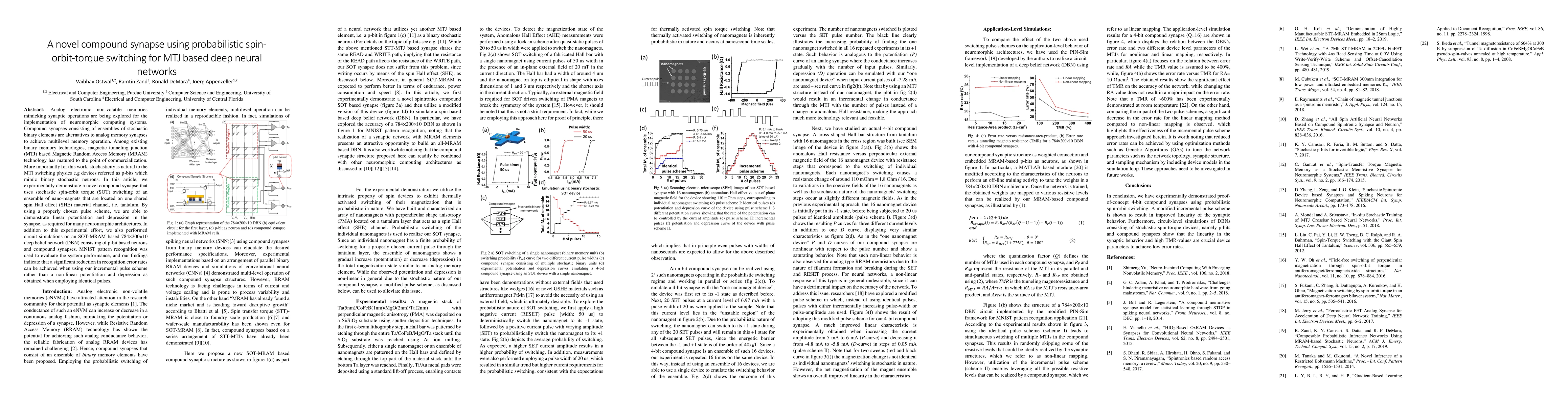 Researchers have developed a novel compound synapse using probabilistic spin-orbit-torque switching for magnetic tunneling junction-based deep neural networks, achieving linear potentiation and depression with improved performance in pattern recognition tasks.