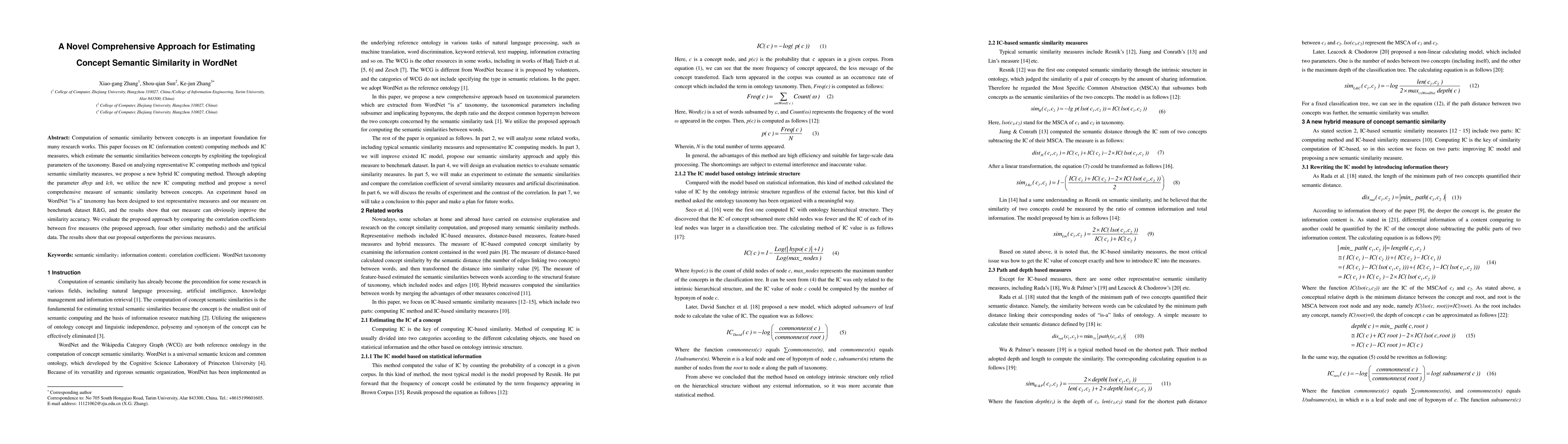 Computation of semantic similarity between concepts is an important foundation for many research works. This paper focuses on IC computing methods and IC measures, which estimate the semantic similarities between concepts by exploiting the topological parameters of the taxonomy. Based on analyzing representative IC computing methods and typical semantic similarity measures, we propose a new hybrid IC computing method. Through adopting the parameter dhyp and lch, we utilize the new IC computing method and propose a novel comprehensive measure of semantic similarity between concepts. An experiment based on WordNet "is a" taxonomy has been designed to test representative measures and our measure on benchmark dataset R&G, and the results show that our measure can obviously improve the similarity accuracy. We evaluate the proposed approach by comparing the correlation coefficients between five measures and the artificial data. The results show that our proposal outperforms the previous measures.